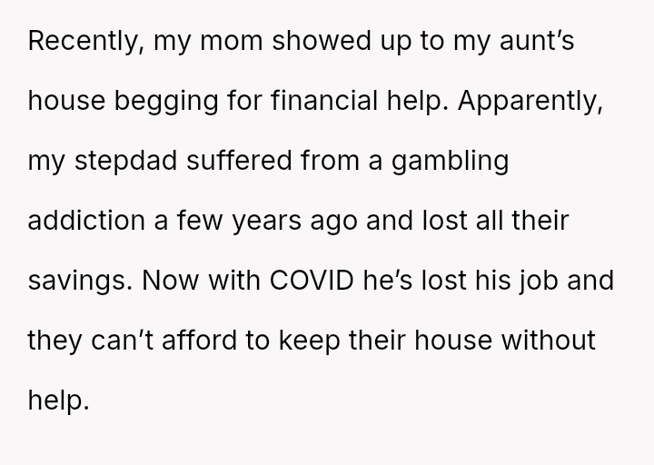 The original poster (OP) is experiencing intense anger and conflict due to their mother and half-siblings resurfacing after years of absence, now demanding financial aid following the step-father's financial mismanagement.