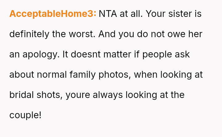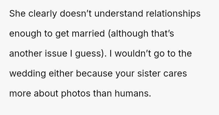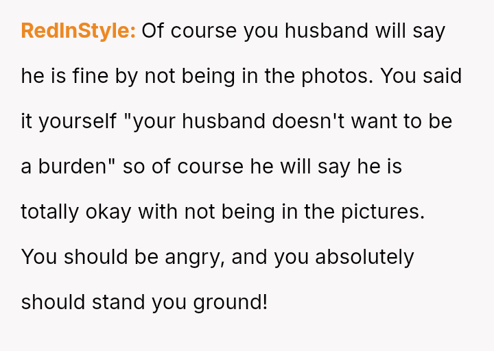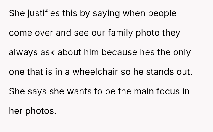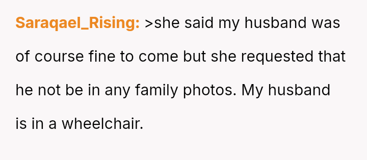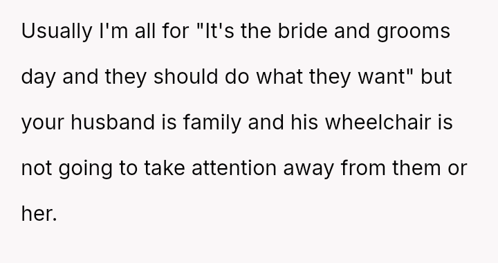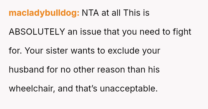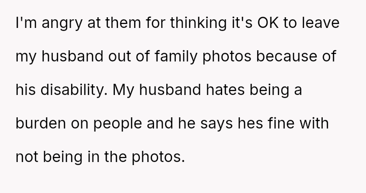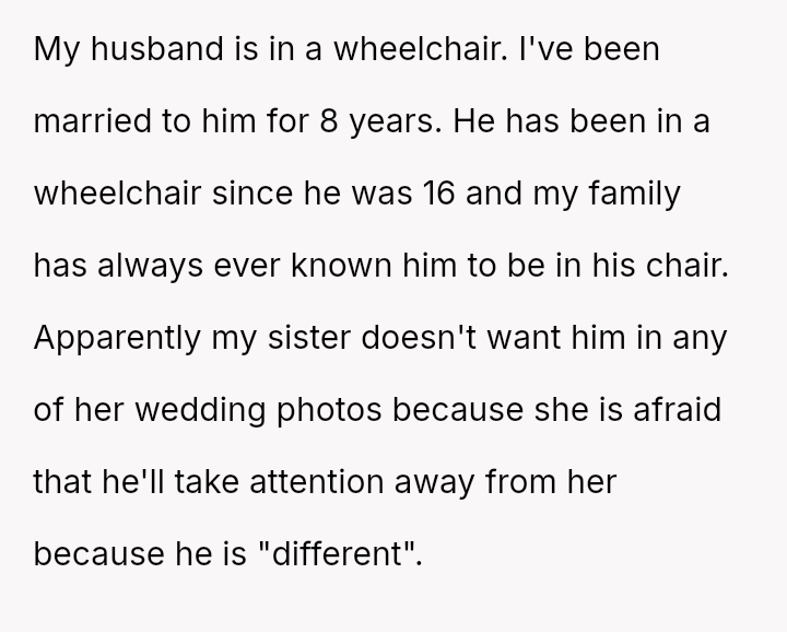Given the strong opposing views—the OP feeling obligated to fight for inclusion versus her husband and family urging attendance and apology—the central question remains: Is it justifiable to boycott a major family event, like a sister's wedding, based on a demand to exclude a spouse from official photos due to disability, or does the obligation to support family outweigh the need to protest this specific exclusionary action?