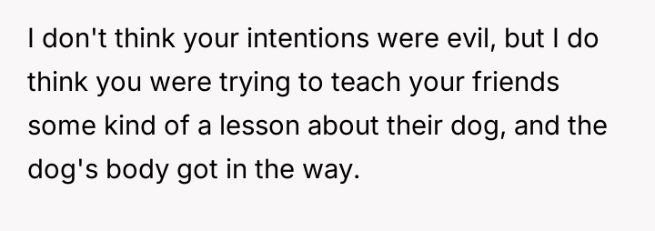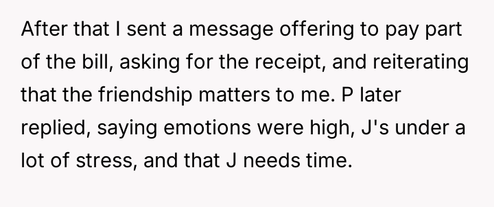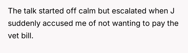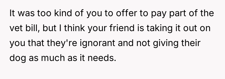 However, this action led to conflict when the dog experienced minor pain afterward, culminating in an accusation from one friend regarding the vet bill before the topic was even formally discussed.