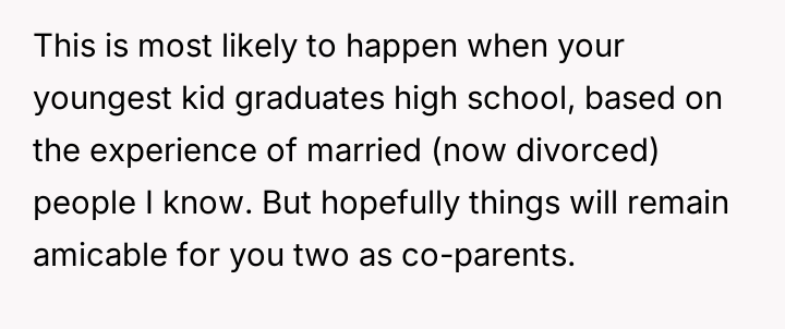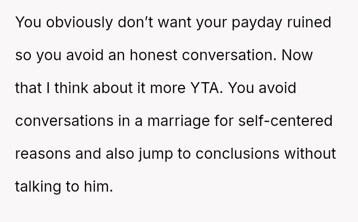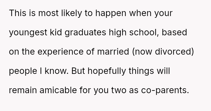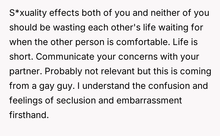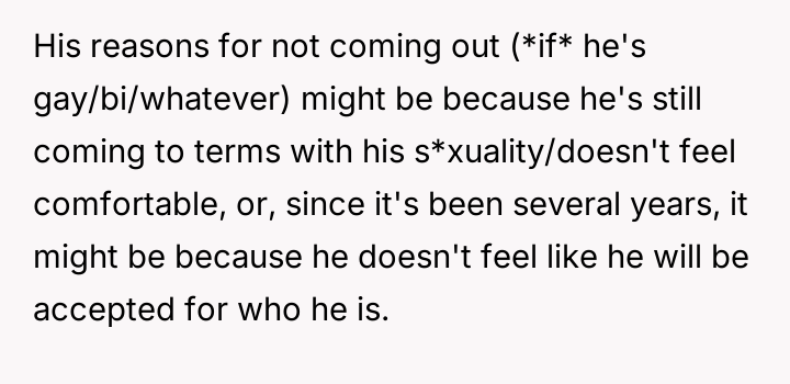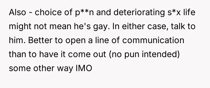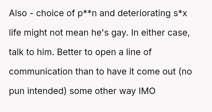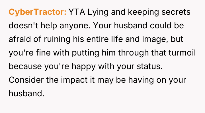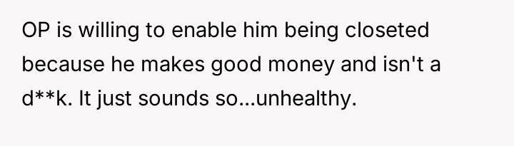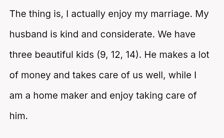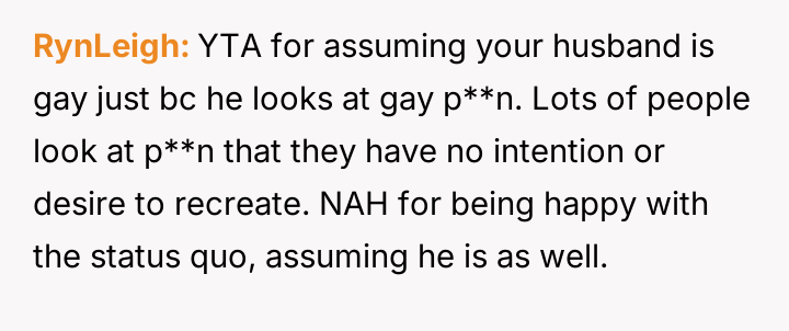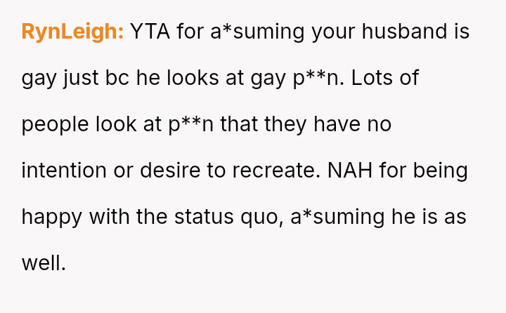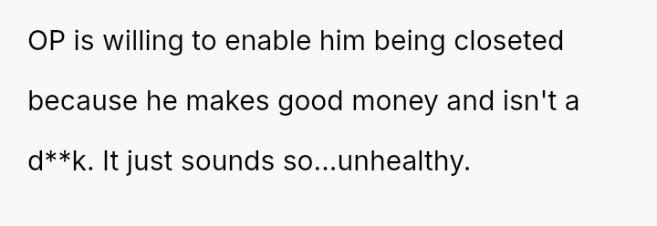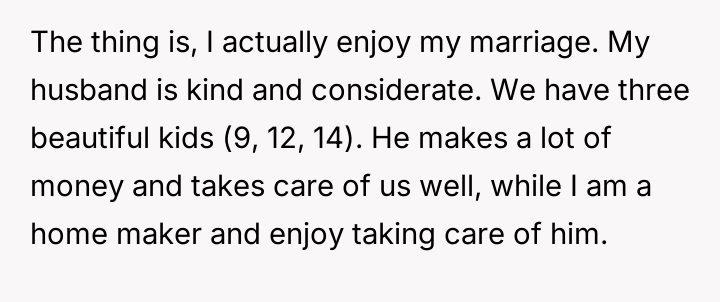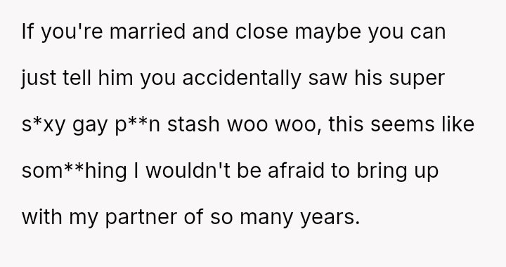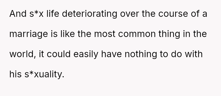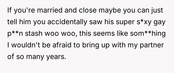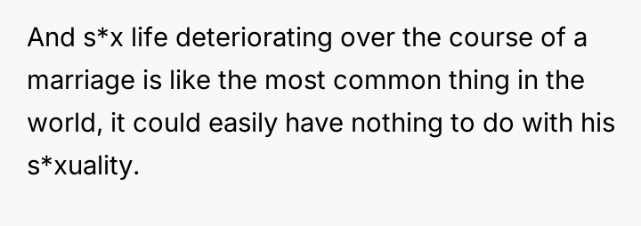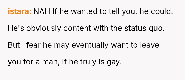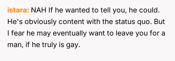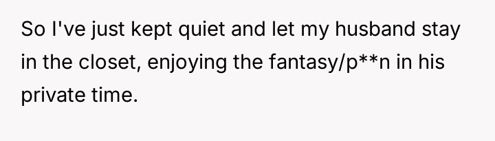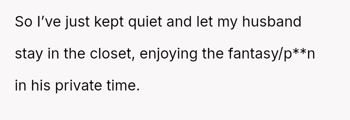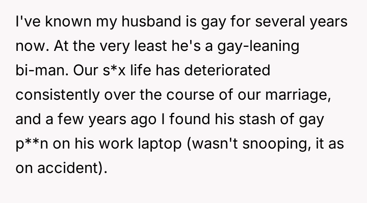 The original poster (OP) is currently maintaining silence about her husband's likely s*xual orientation and related private activities to preserve the s**bility of her family, despite knowing the truth for years.