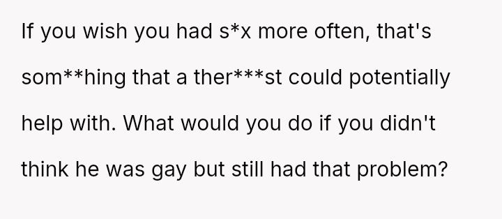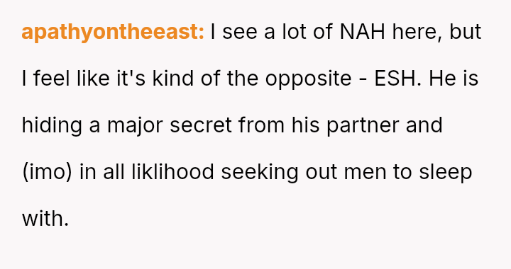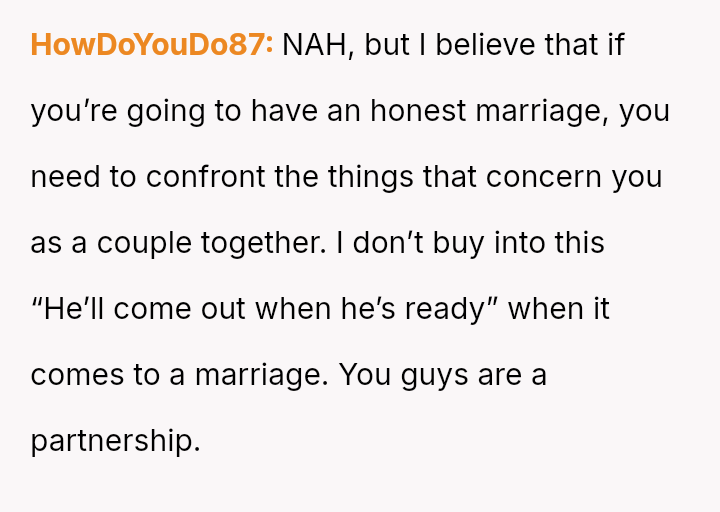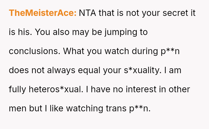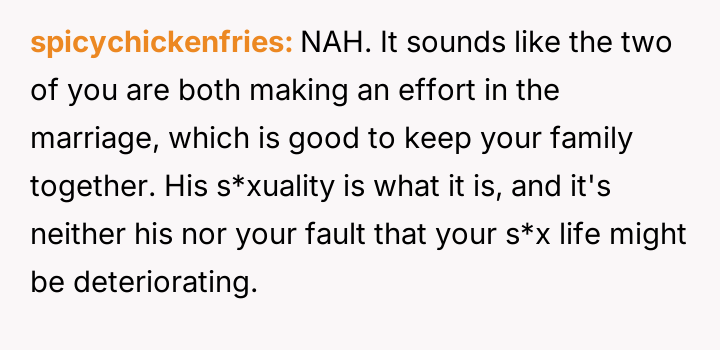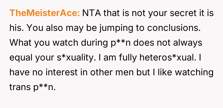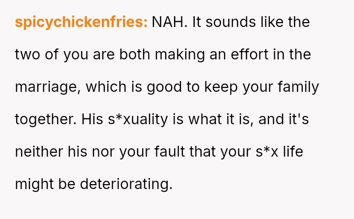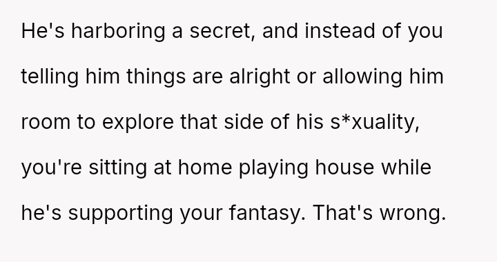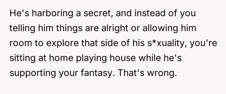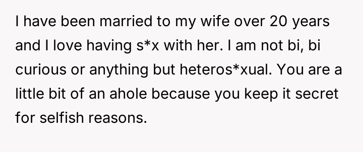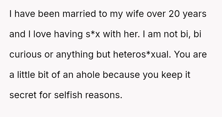 Is the OP justified in prioritizing the current s**ble family unit by remaining silent about her husband's s*xuality and private habits, or does this sustained deception compromise the marriage to an extent that makes the potential future ex****ion worse than addressing the issue now?