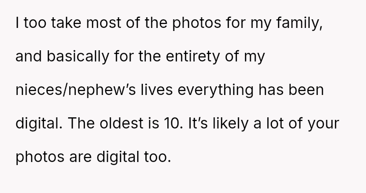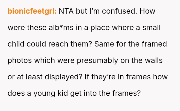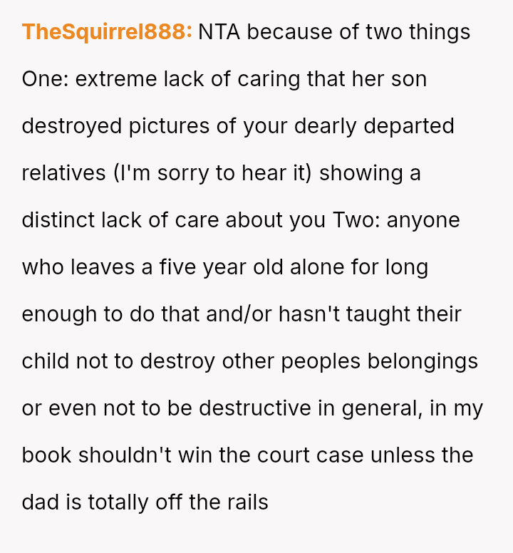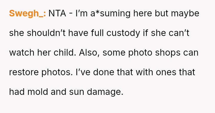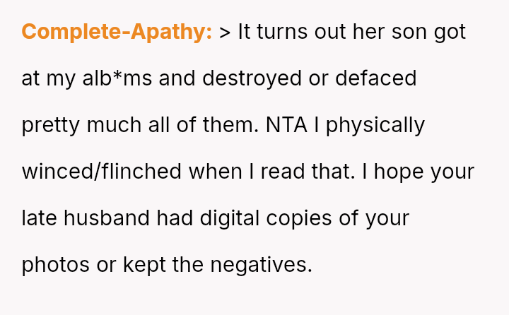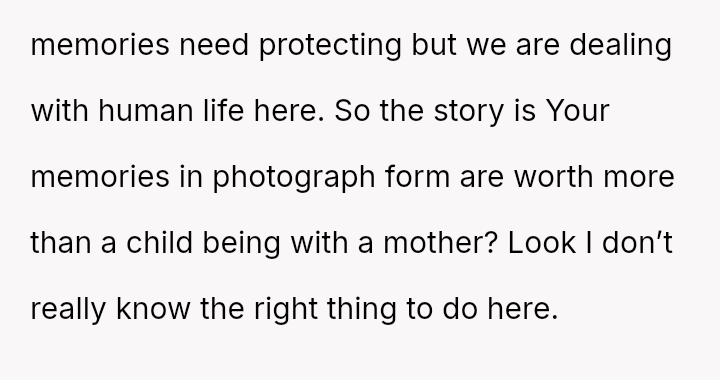 The original poster is grappling with a severe emotional loss triggered by the destruction of irreplaceable family photographs by their friend's young son.