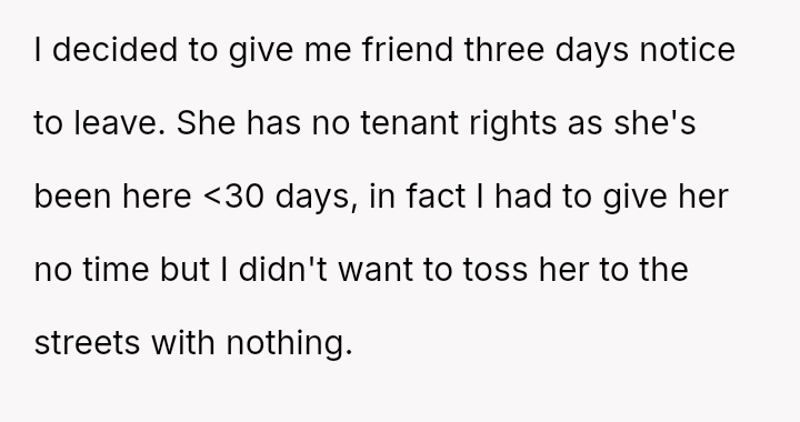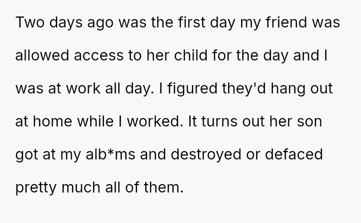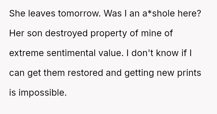 While the friend was offered refuge during a difficult custody dispute, this act led to the poster enforcing an immediate departure, prioritizing their profound sentimental loss over their friend's precarious housing situation.