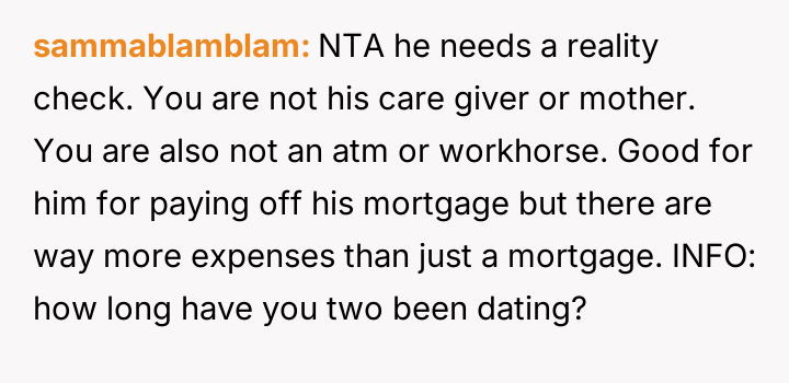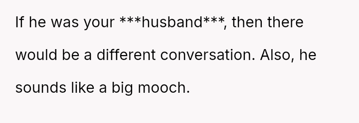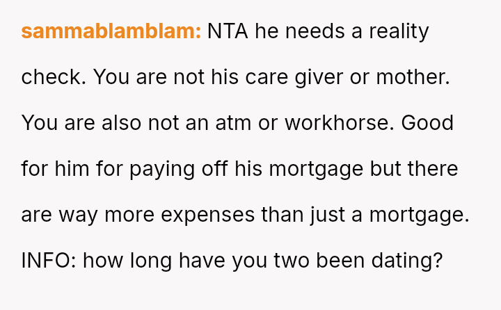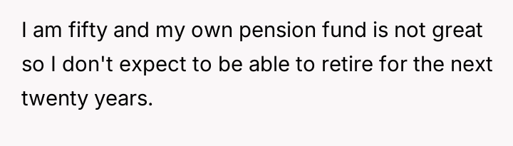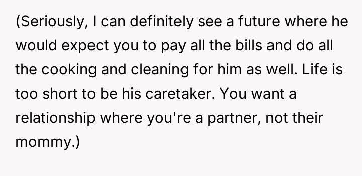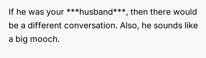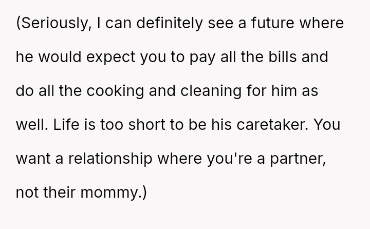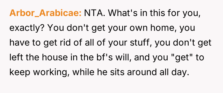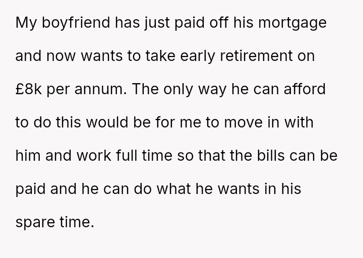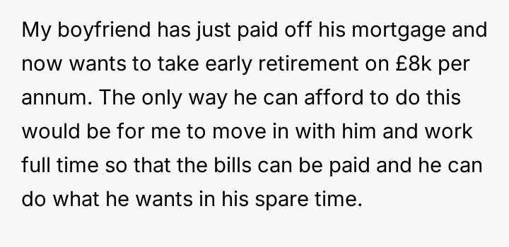 The conflict is clear: her boyfriend expects a significant life change and financial contribution from her so he can stop working, while she views this arrangement as unfair given her own need to work for another two decades and the lack of reciprocal support.