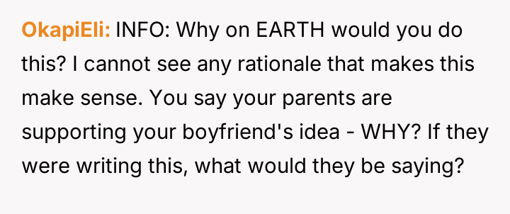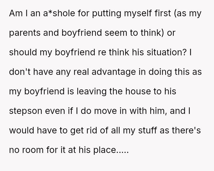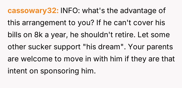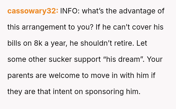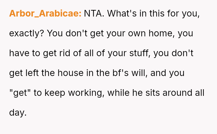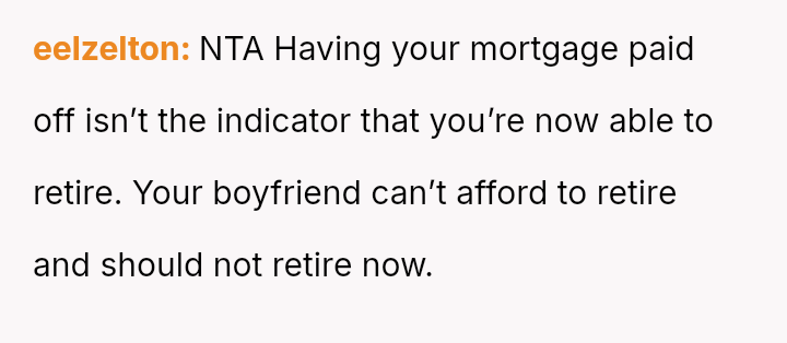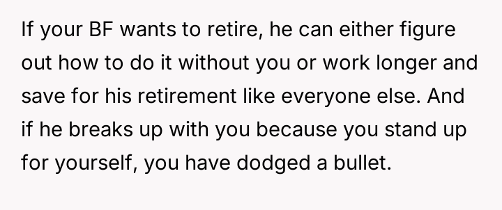 The original poster is facing a major life decision that pits her personal long-term financial security and career goals against her boyfriend's desire for early retirement funded by her continued full-time employment.