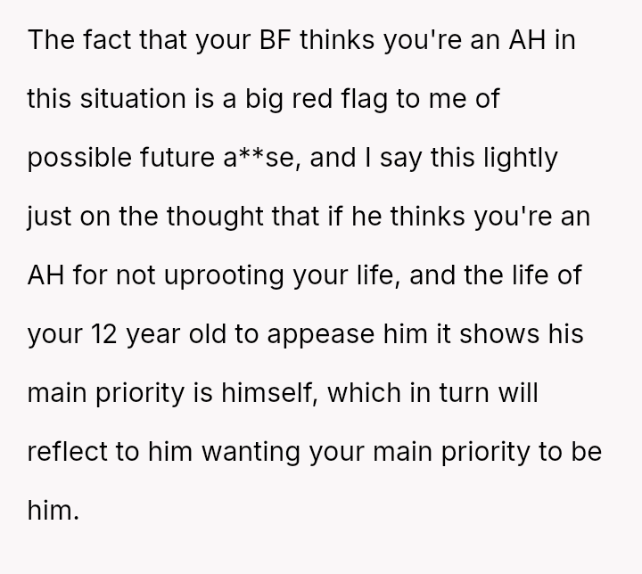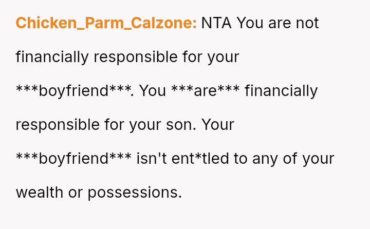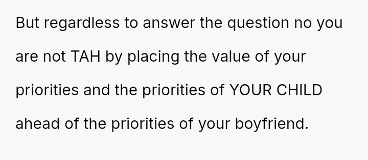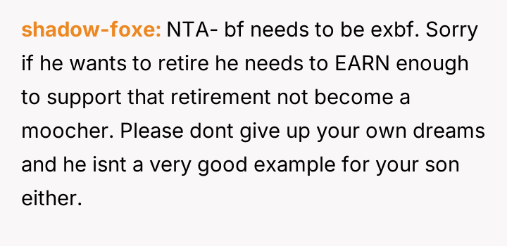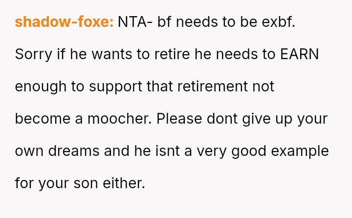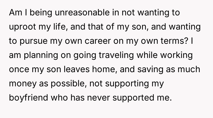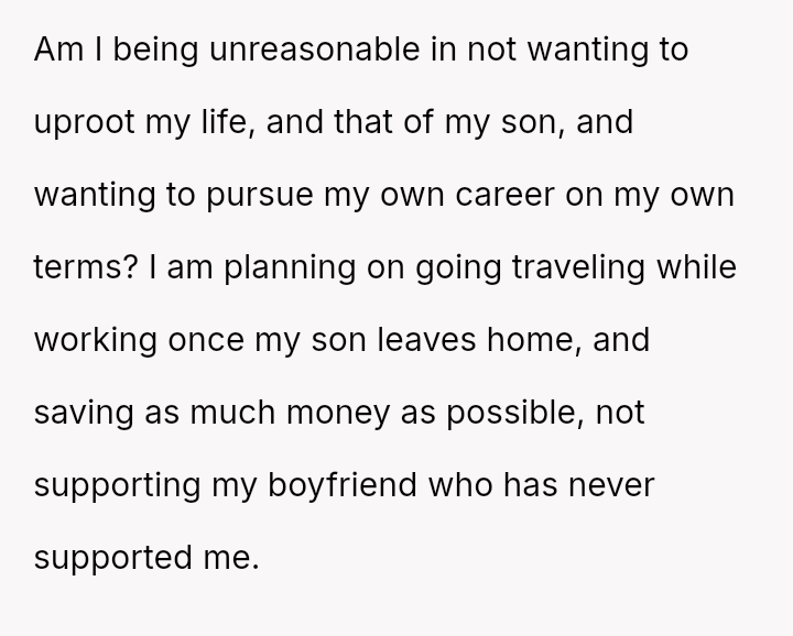 Is the poster unreasonable for prioritizing her es**blished career path, her son's s**bility, and her future retirement over immediately supporting her boyfriend's lifestyle change, or is the boyfriend justified in expecting her to sacrifice her career plans to subsidize his early retirement?