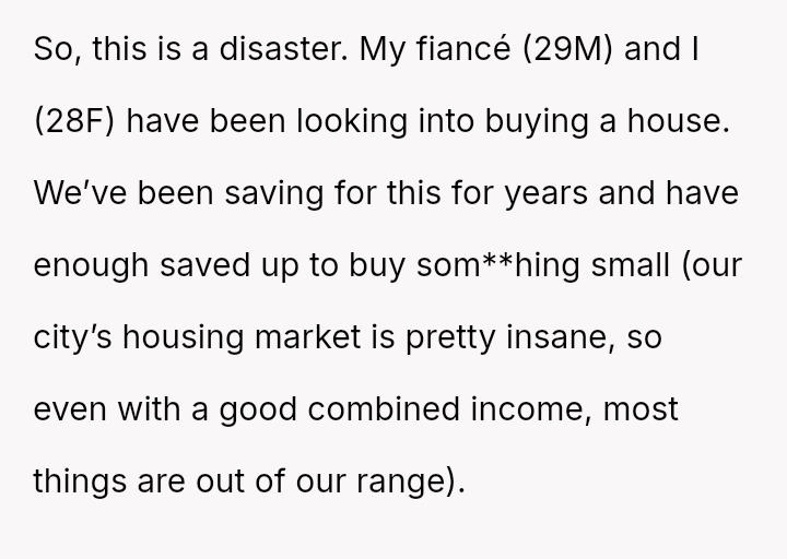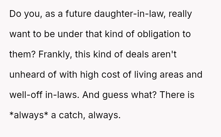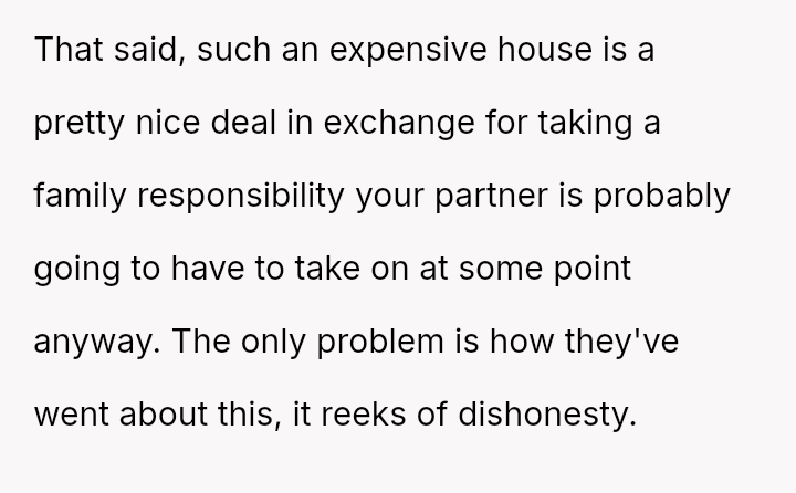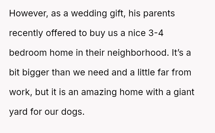 The original poster and their fiancé are caught between accepting a significant financial gift—a house provided by the fiancé's parents—and adhering to their personal boundaries regarding shared living space.