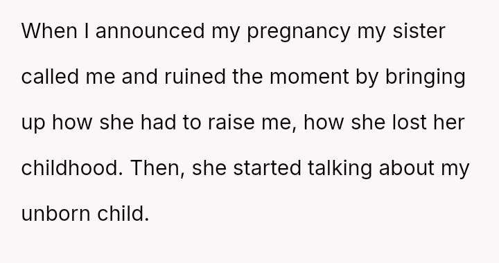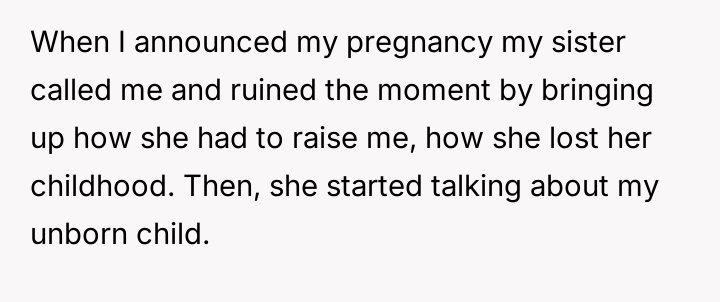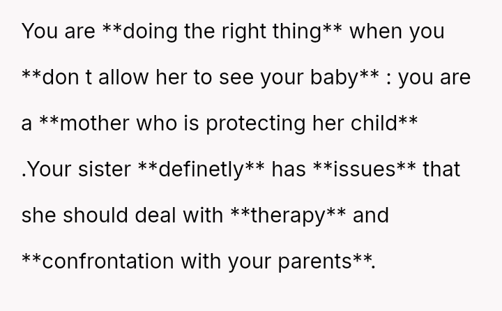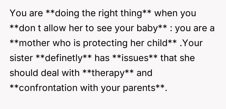 The original poster (OP) is feeling conflicted and potentially guilty for protecting her newborn son from her sister, who previously inflicted emotional distress during the pregnancy by repeatedly blaming the OP for her lost childhood.
