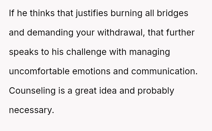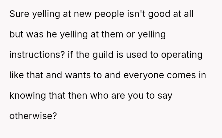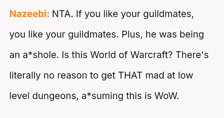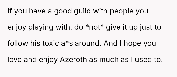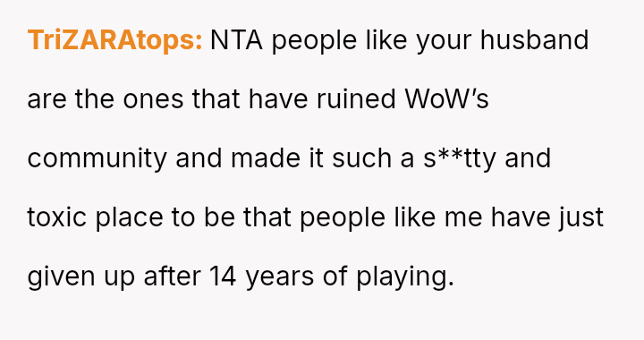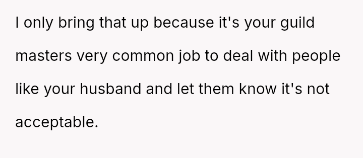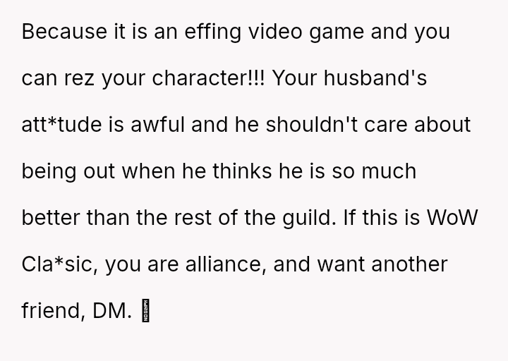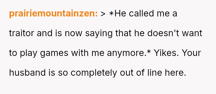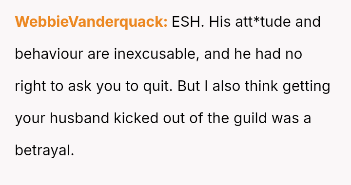While the OP attempted to address the husband's anger through repeated conversations, the husband reacted defensively and escalated the situation by quitting the guild and demanding the OP follow suit, labeling her a "traitor" for prioritizing her peace and the opinions of their online community over his demand.