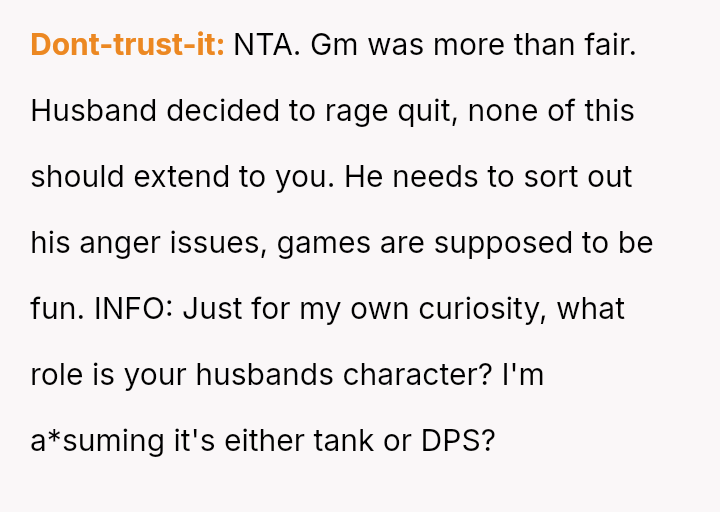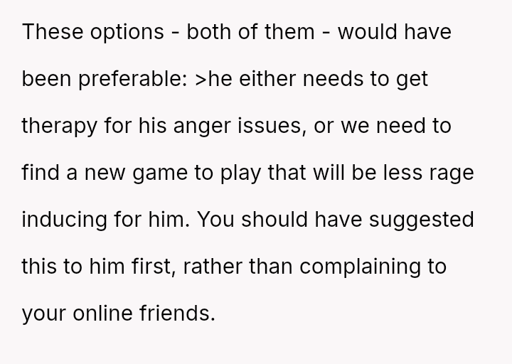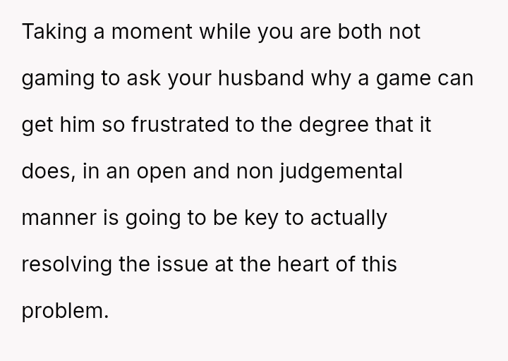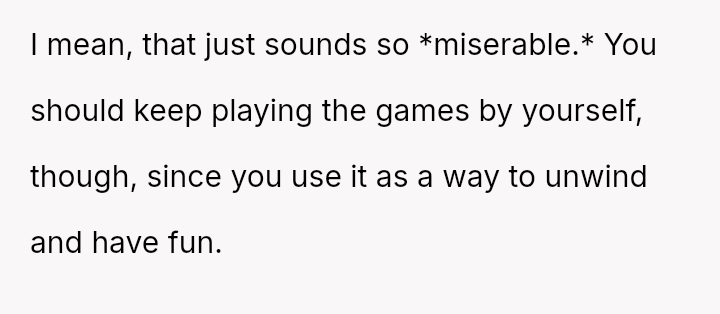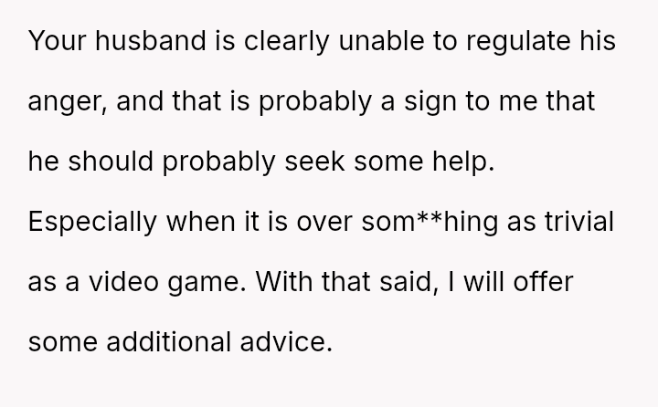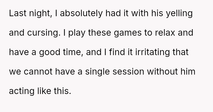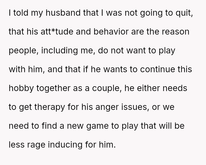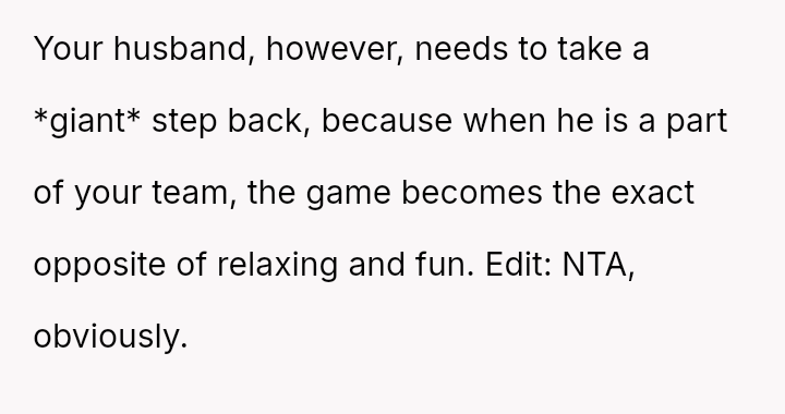 The original poster is facing a significant conflict between maintaining their enjoyment of a shared hobby and the aggressive behavior exhibited by their husband during gaming sessions.