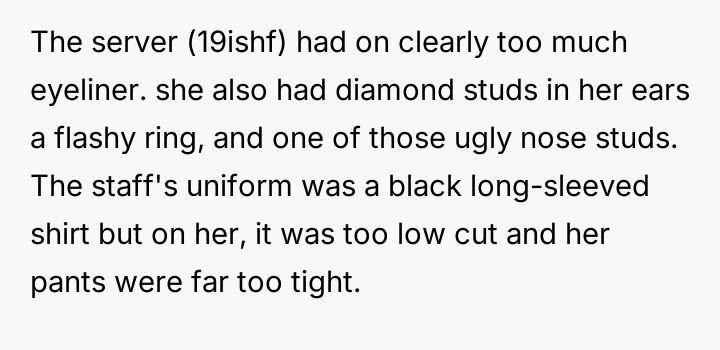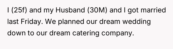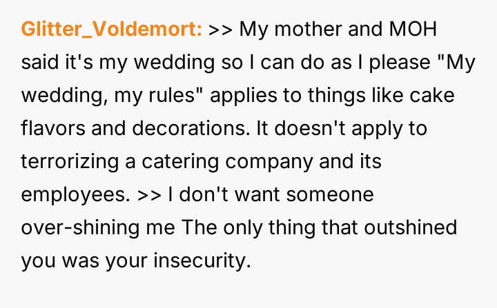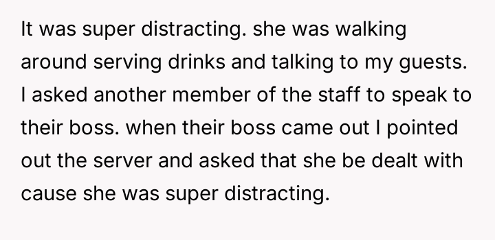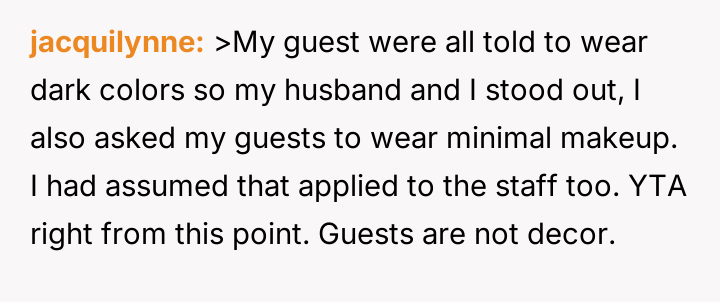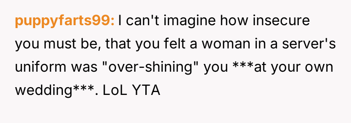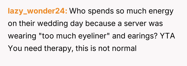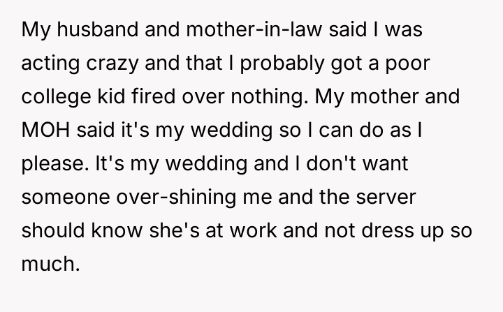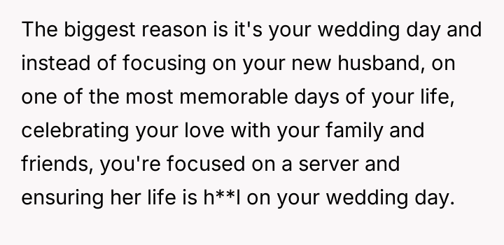The original poster felt distressed and undermined by a catering server whose appearance did not meet the specific aesthetic guidelines set for the wedding.