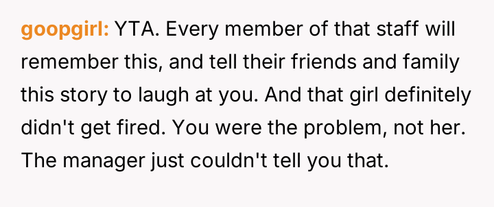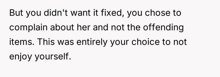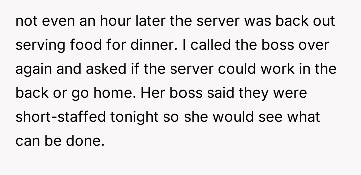 This led to a significant conflict where the OP exerted control over the situation by repeatedly demanding the staff member be removed, causing the server to be sent home, which in turn created a disagreement with her husband and mother-in-law about the severity of the reaction.