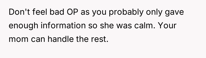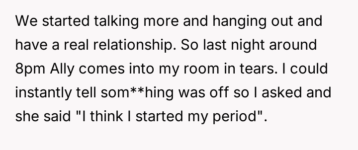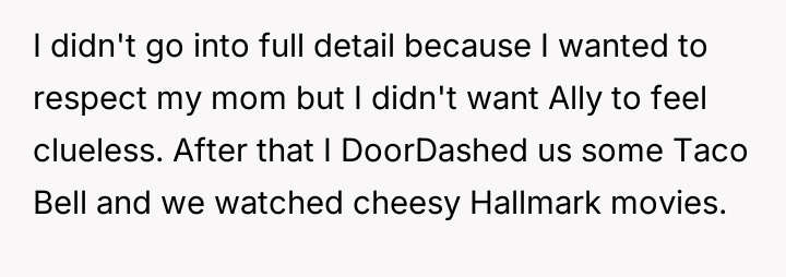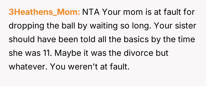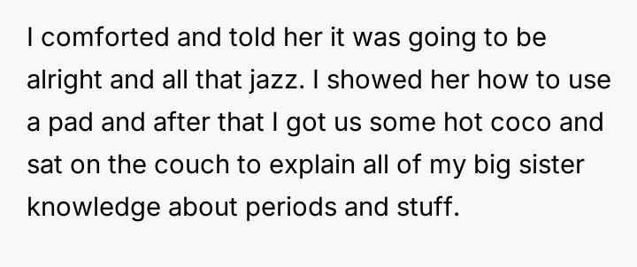 The original poster (OP) experienced a moment of unexpected closeness with their younger sister during a vulnerable time, stepping in to provide comfort and basic information about men******ion when their mother was unavailable due to work.