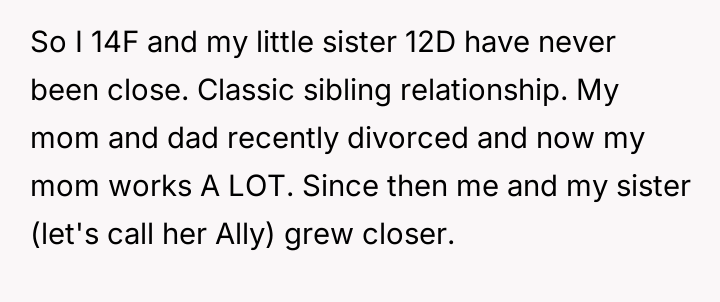 In the quiet aftermath of their parents' divorce, two sisters found an unexpected bond blossoming between them.