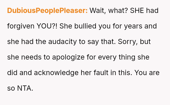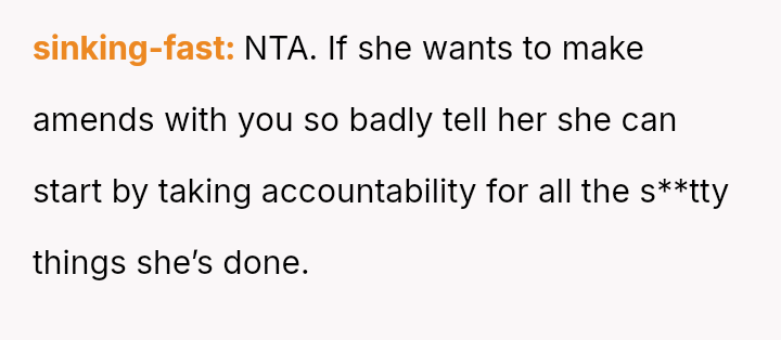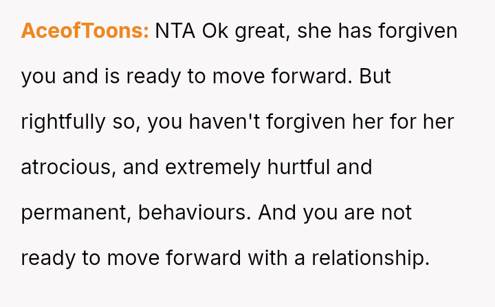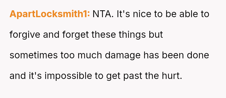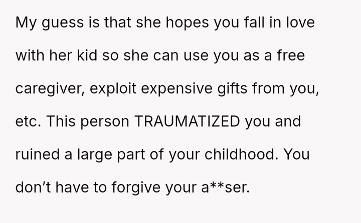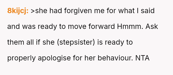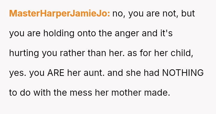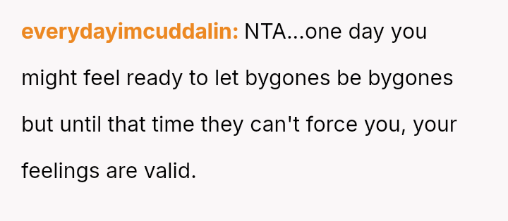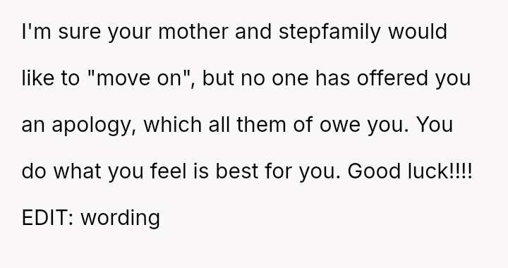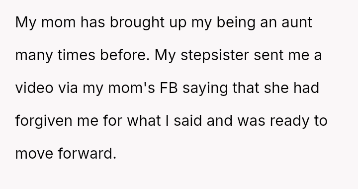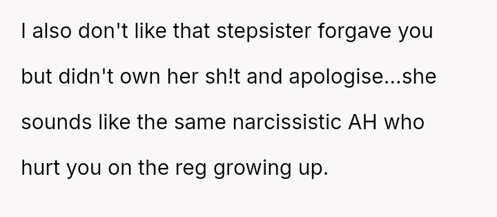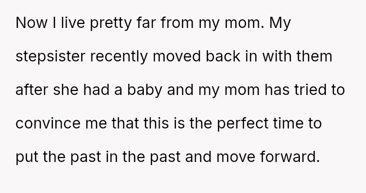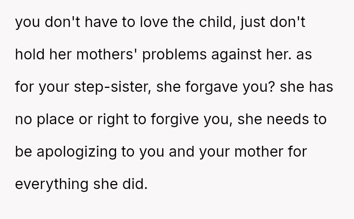 Given the documented severity and persistence of the stepsister's past behaviors versus the family's strong push for forgiveness and moving on, is the OP justified in refusing all contact and acknowledgment of the new baby to protect her emotional well-being, or does the familial desire for peace and connection outweigh the OP's need to enforce consequences for past actions?