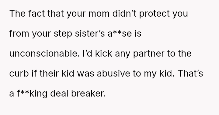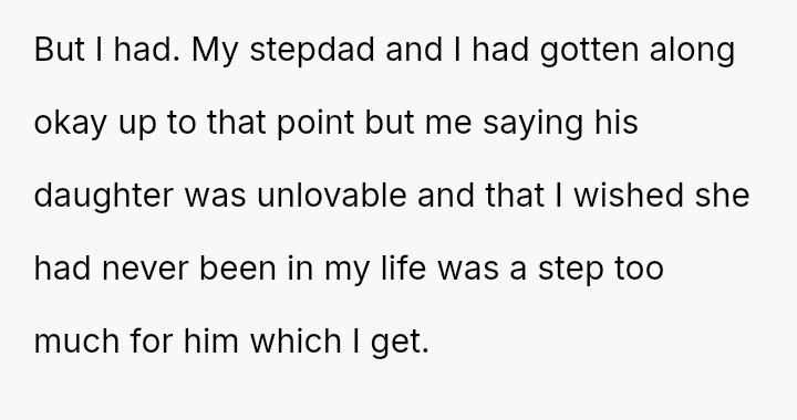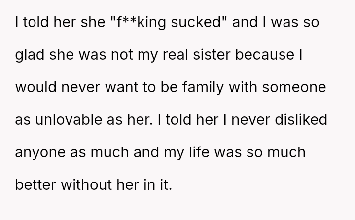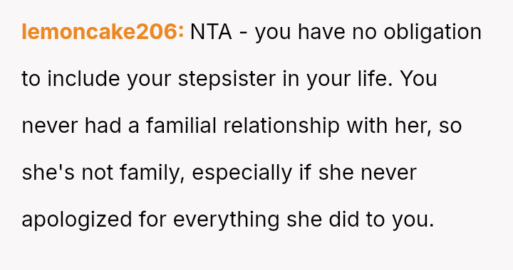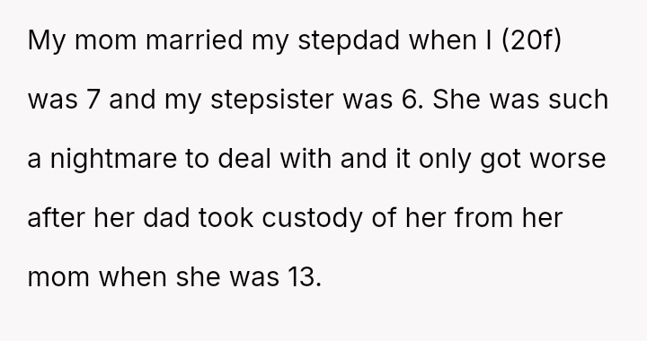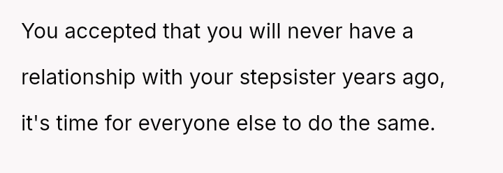The original poster (OP) is maintaining a firm boundary against involving herself in the life of her stepsister, viewing the relationship as permanently damaged by years of significant mistreatment, including property destruction and personal h***ssment.