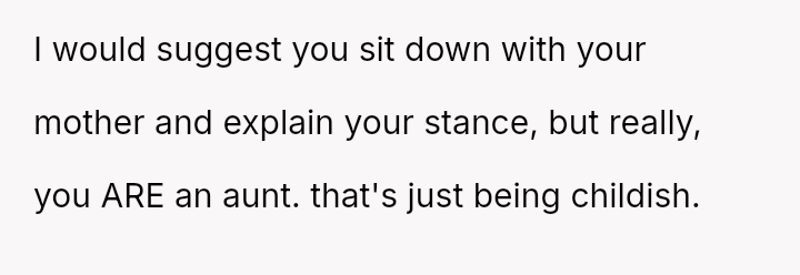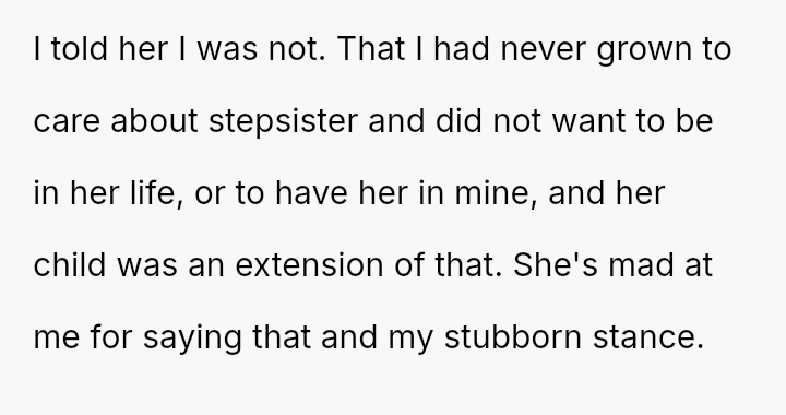 This stance directly conflicts with her mother's desire for reconciliation and the acceptance of her role as an aunt, creating tension within the immediate family structure.
