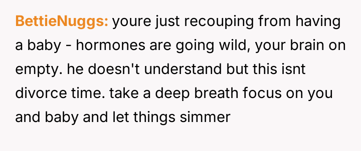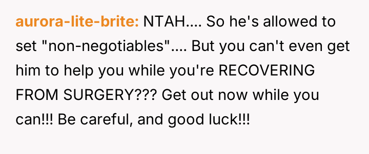 Given the husband's pattern of dismissiveness and prioritizing his own schedule over the OP's stated critical needs, is the OP's extreme reaction of contemplating divorce justified by the severity of her unmet emotional and physical support requirements, or does the recent trauma make her current reaction disproportionate to the ongoing marital issues?