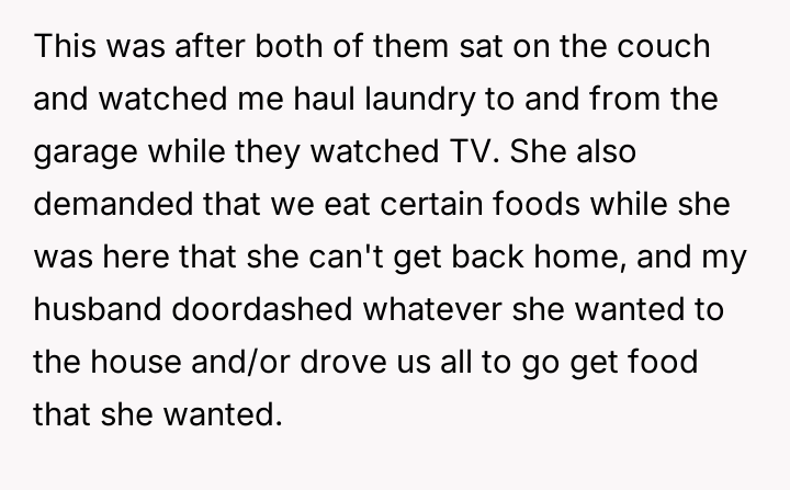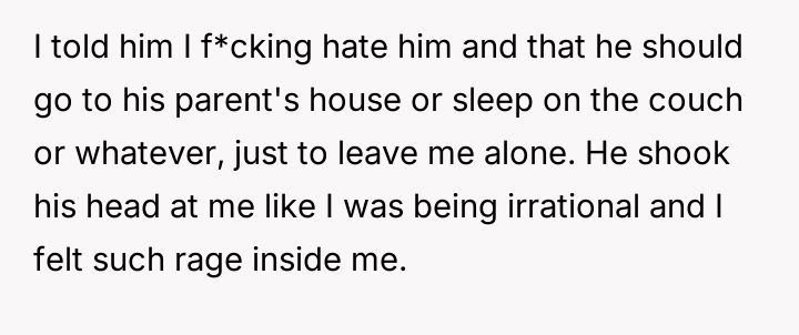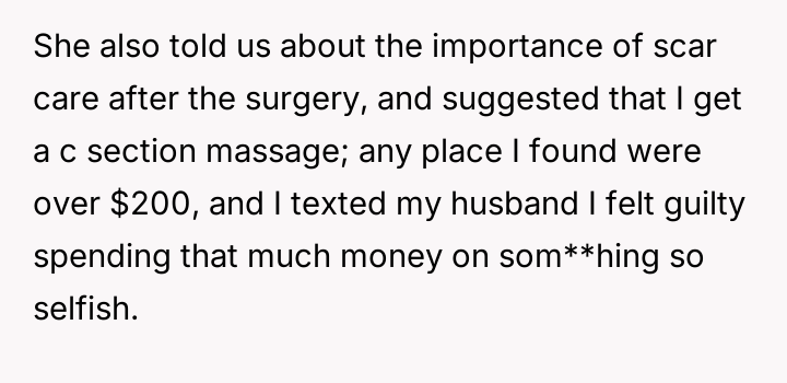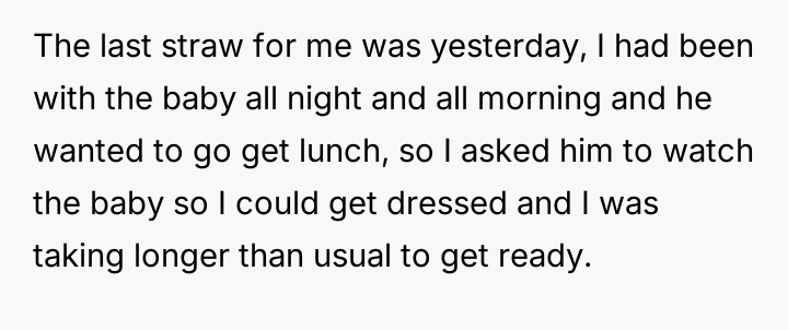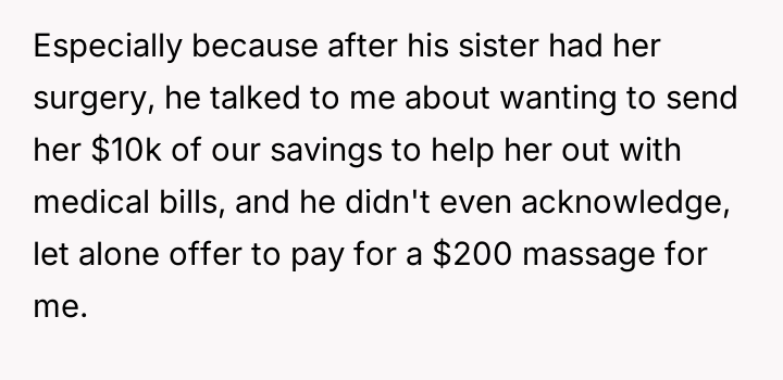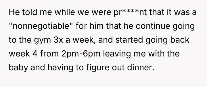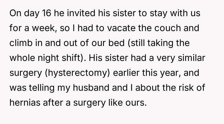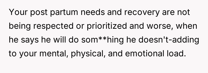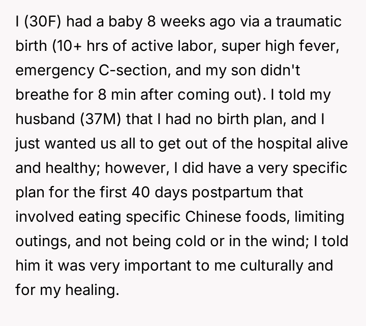 Her central conflict stems from the husband's failure to honor explicit postpartum care agreements, prioritizing external demands (his sister's visit, his gym time) and casual outings over her culturally significant healing needs and basic physical comfort after major surgery.