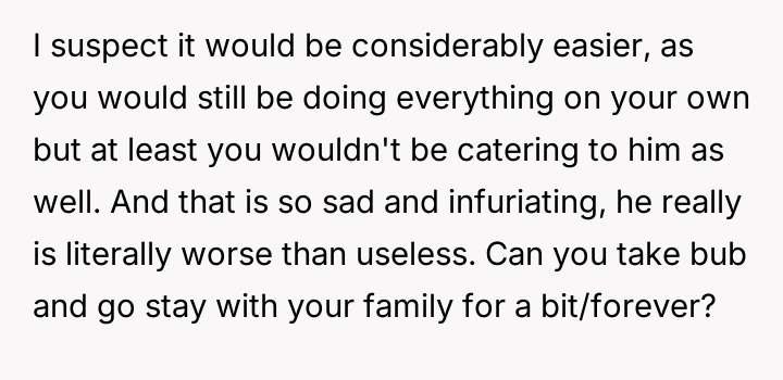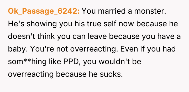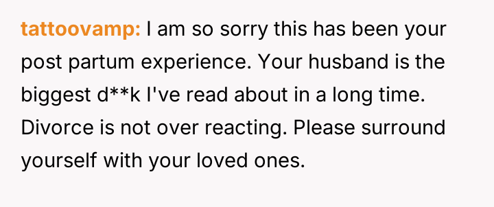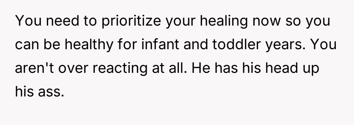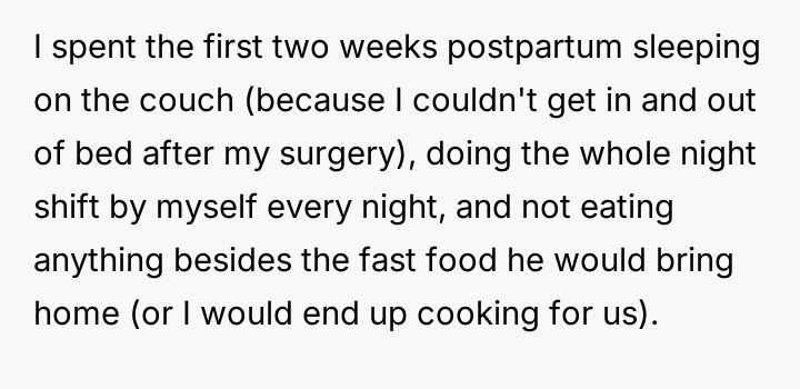The original poster (OP) is navigating severe physical recovery from a traumatic birth while experiencing a profound emotional disconnect and lack of support from her husband.