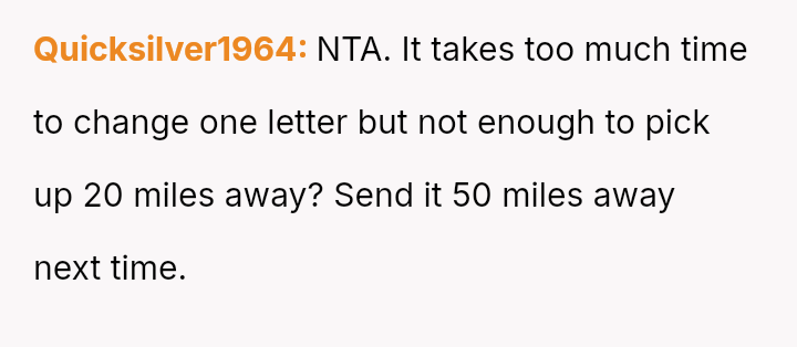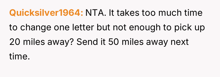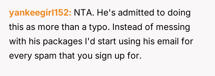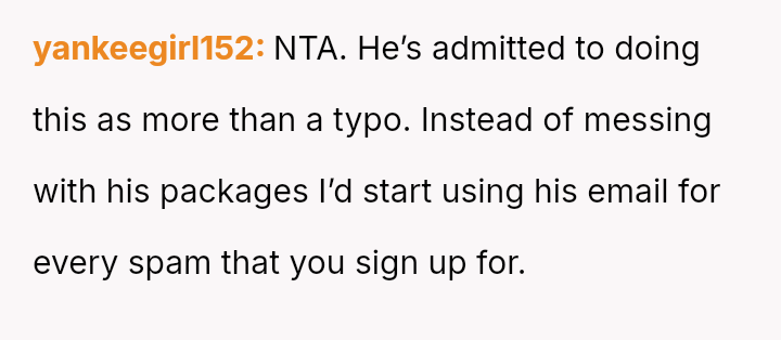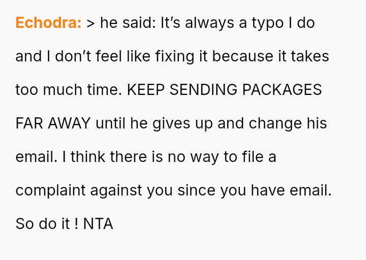 Feeling inconvenienced and frustrated by the other person's refusal to correct their consistent typo, the OP resorted to actively interfering with the delivery logistics, causing the packages to be redirected far away.