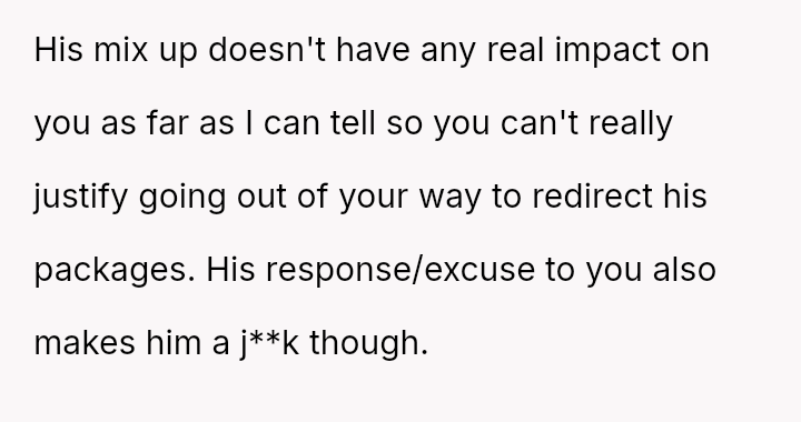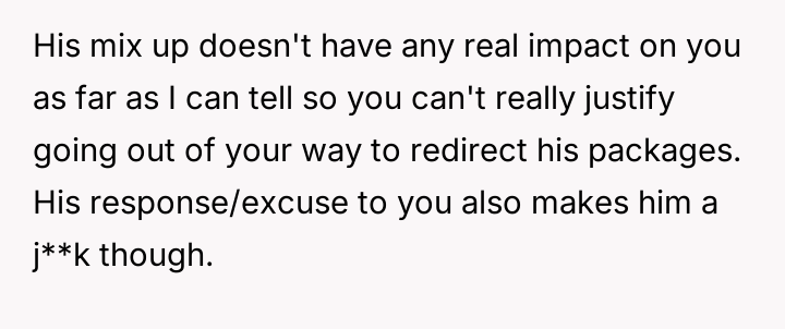 Is the OP justified in intentionally disrupting the deliveries as a response to the neighbor's laziness and refusal to correct a simple typo, or did this action cross a line into unnecessary sabotage against a problem that could have been solved via simple communication?