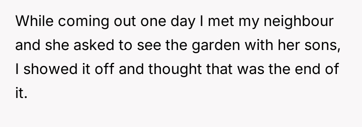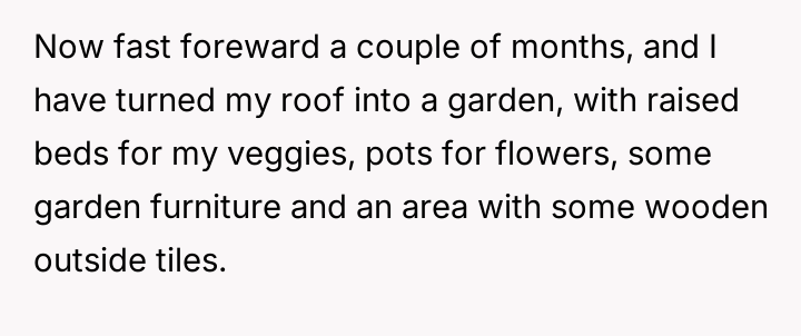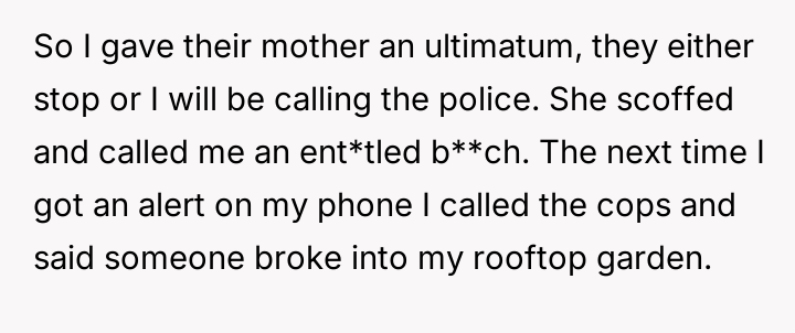 The original poster (OP) faced a direct v***ation of privacy and property rights when neighbors' children trespassed and damaged their private rooftop garden, leading to an escalation where OP called the police.