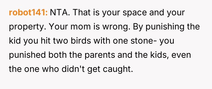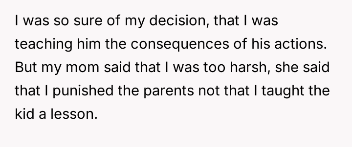 The central conflict lies between the OP's need to enforce firm boundaries against repeated boundary v***ations and the perspective of their mother, who believes the OP's response was overly severe and focused on punishment rather than teaching the juvenile involved a constructive lesson.