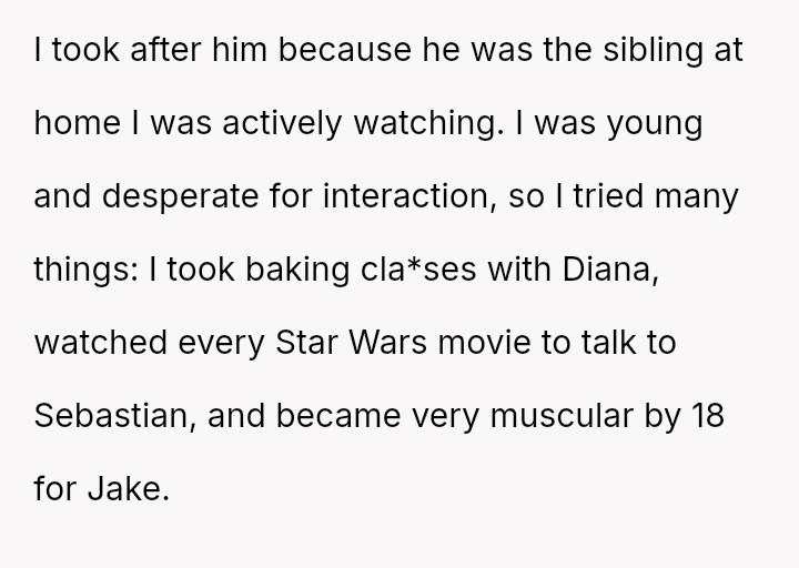 His bond with Jake, the athletic and disciplined brother, becomes a lifeline, shaping his ident*ty through admiration and shared moments that bridge age and interests.