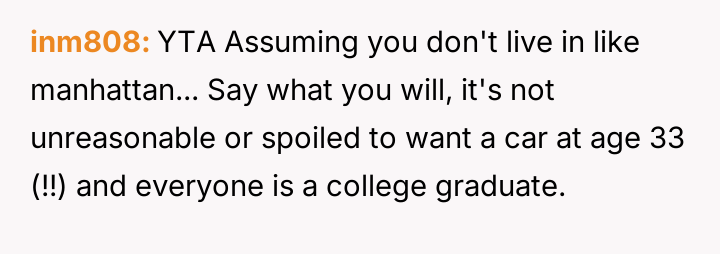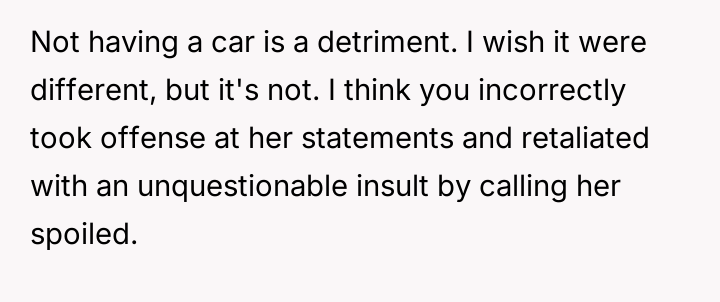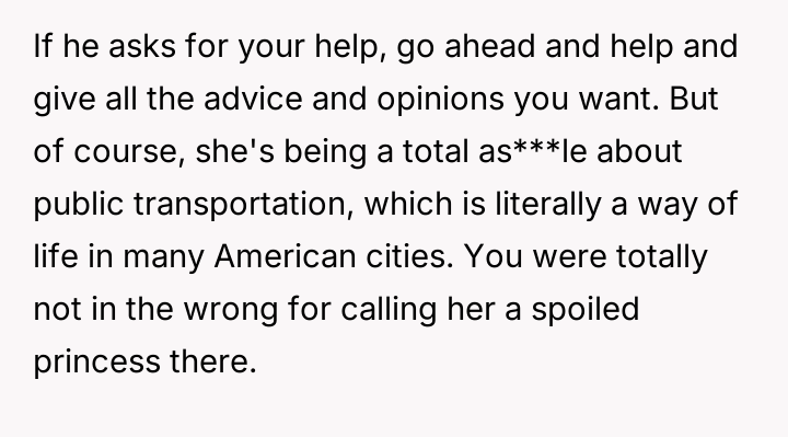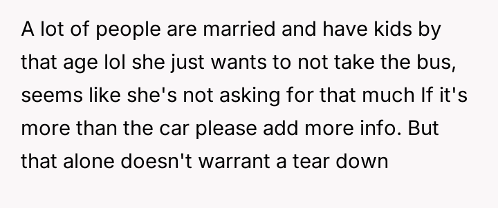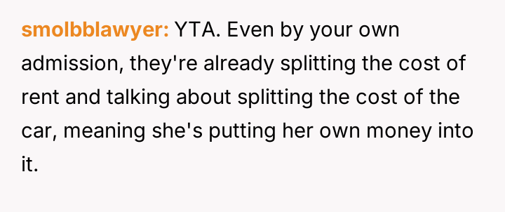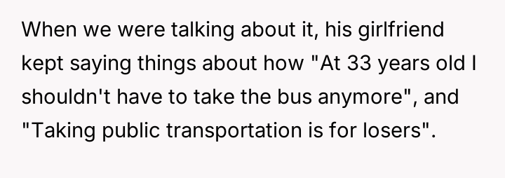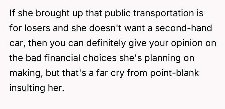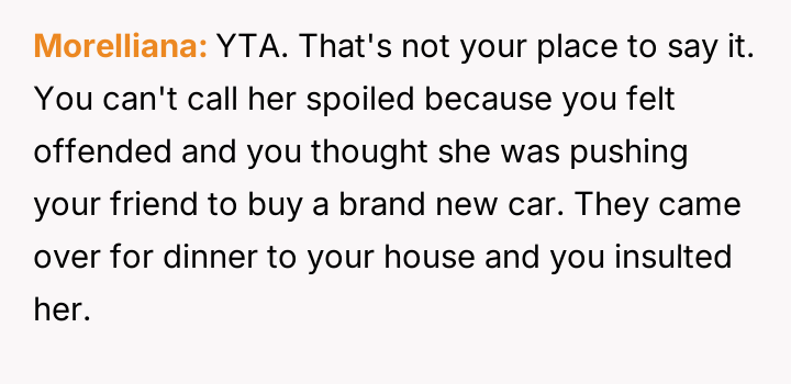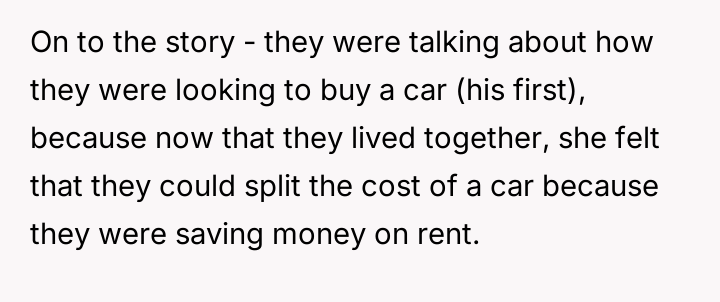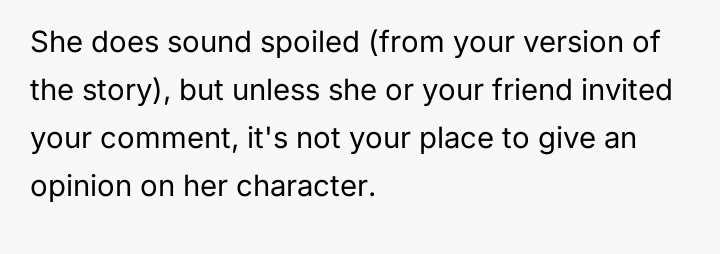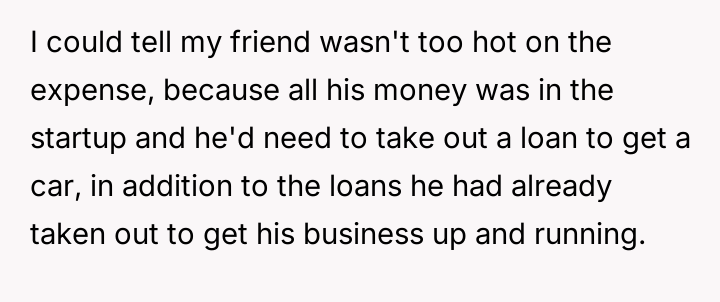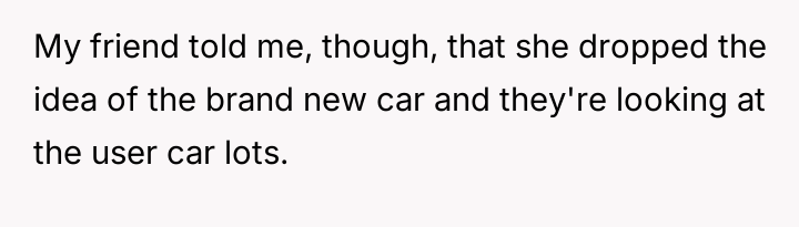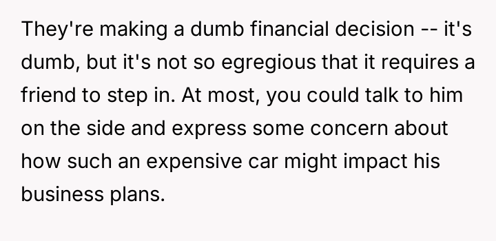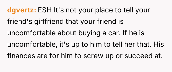 The original poster (OP) became frustrated by a friend's girlfriend making demanding and seemingly inconsiderate statements about purchasing an expensive new car while the friend was financially strained due to his startup.