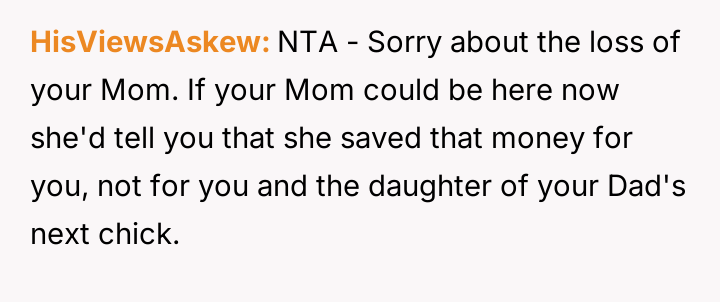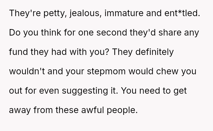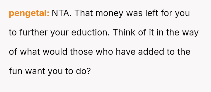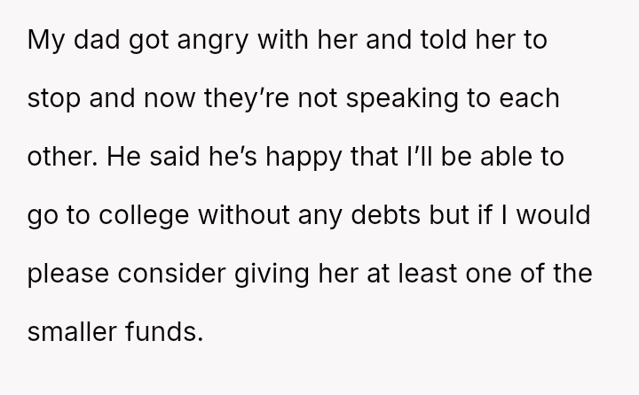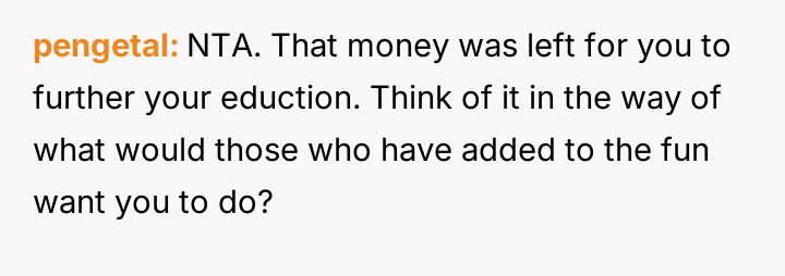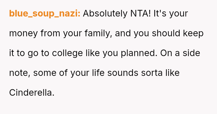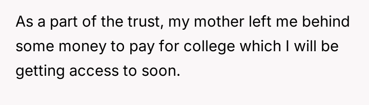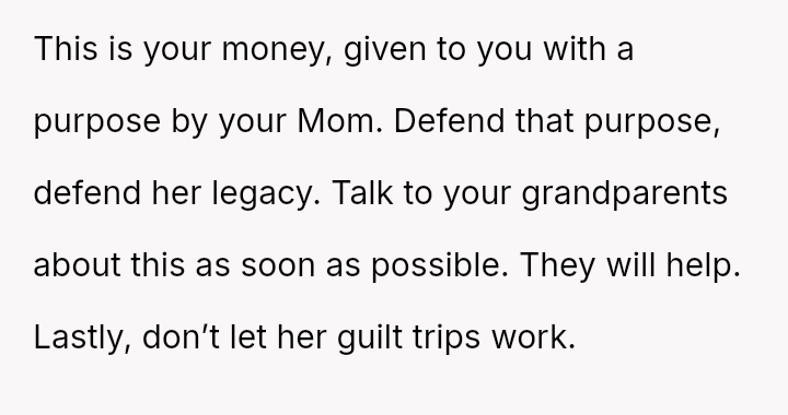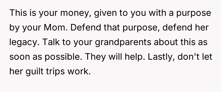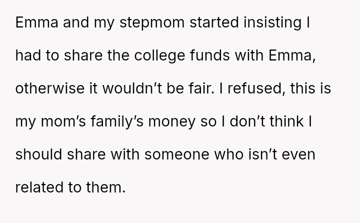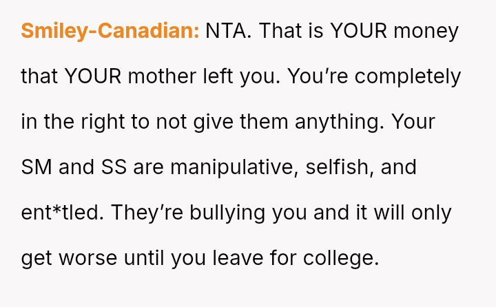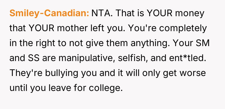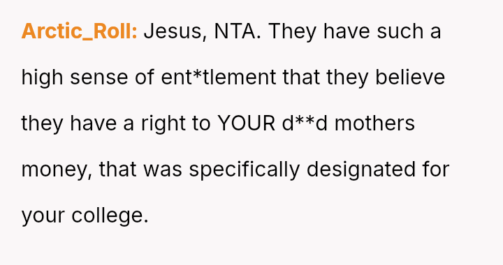 The original poster (OP) is facing intense emotional pressure from their stepfamily regarding college funds that were specifically designated by their deceased mother.