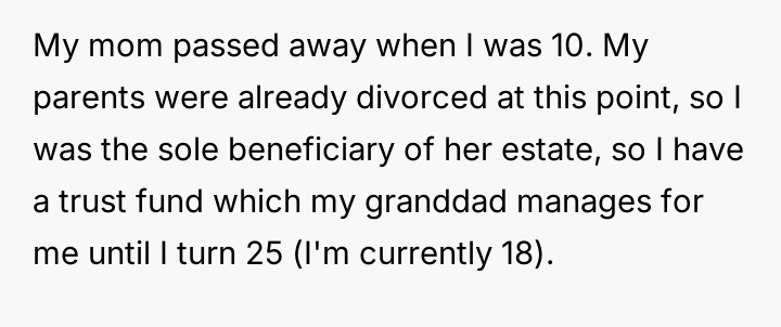 The central conflict arises from the OP's assertion of their legal and familial right to their inheritance versus the stepmother's and stepsisters' perceived ent*tlement to that money, fueled by financial ins**bility within the father's household.