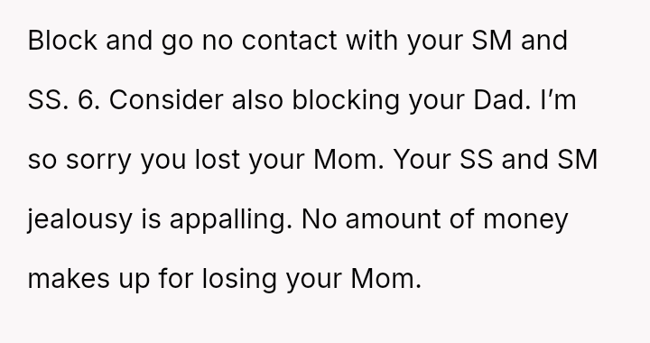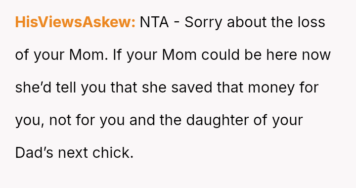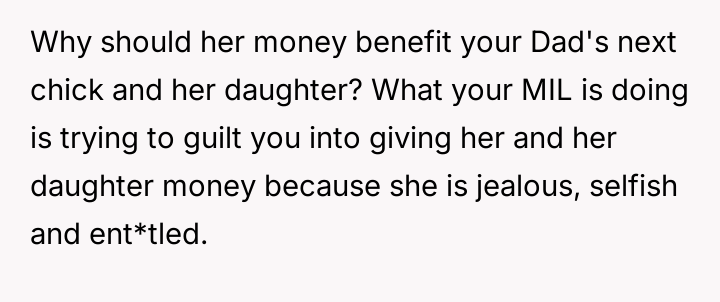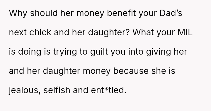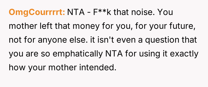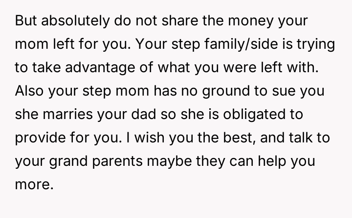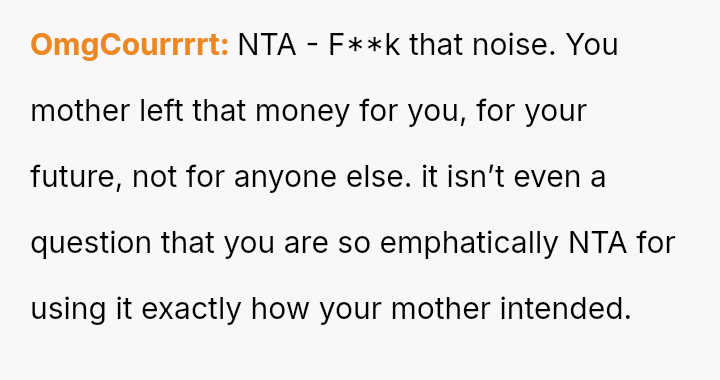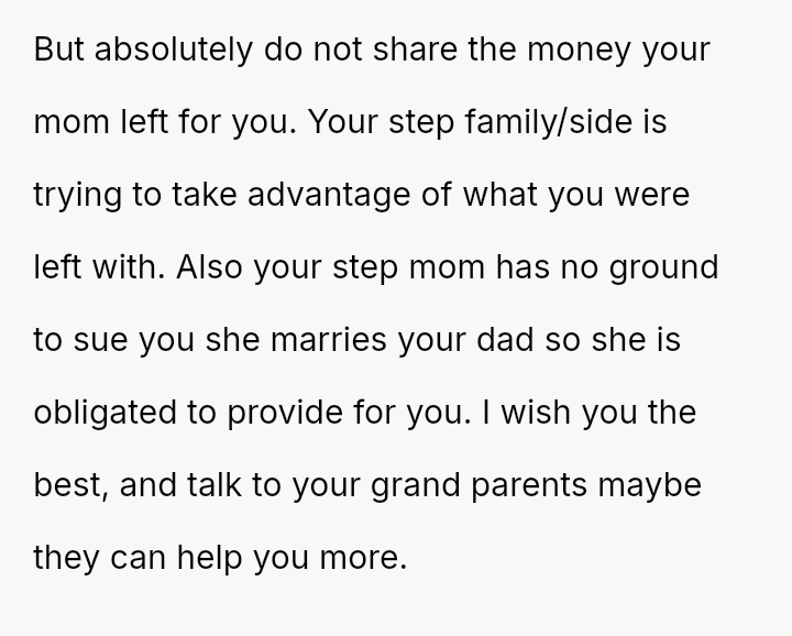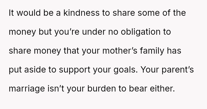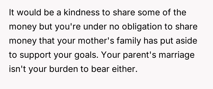 Given the clear designation of the funds belonging to the OP through their mother's estate, is the OP obligated in any way, ethically or otherwise, to share their inheritance with their stepsister, or does their firm refusal correctly uphold the boundaries es**blished by their mother's will?