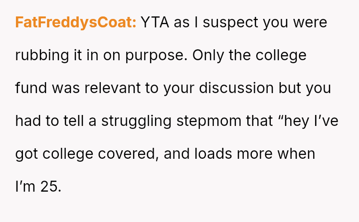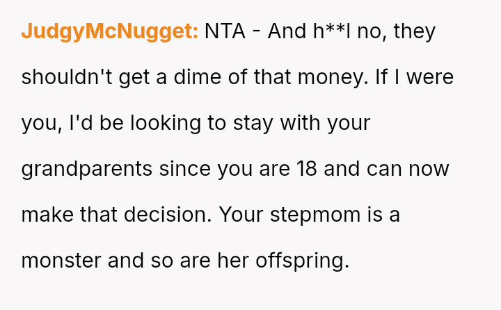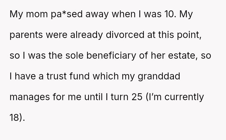 The central conflict arises from the OP's a*sertion of their legal and familial right to their inheritance versus the stepmother's and stepsisters' perceived ent*tlement to that money, fueled by financial ins**bility within the father's household.