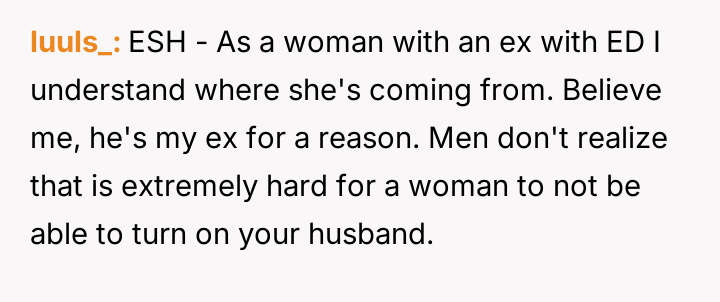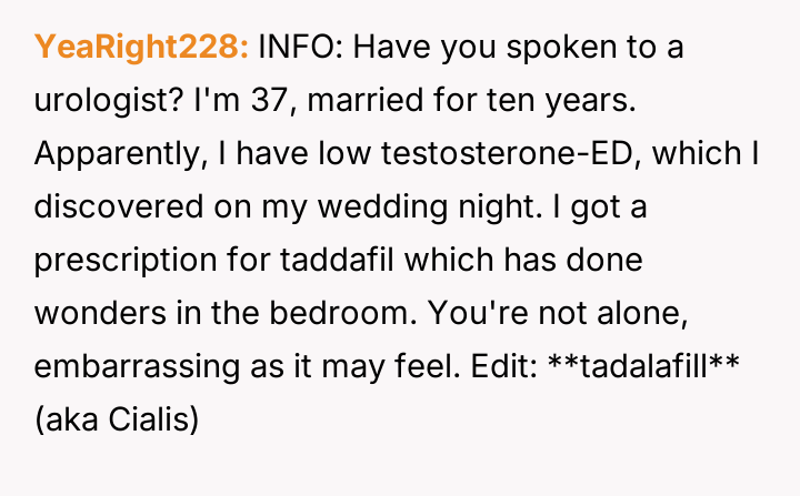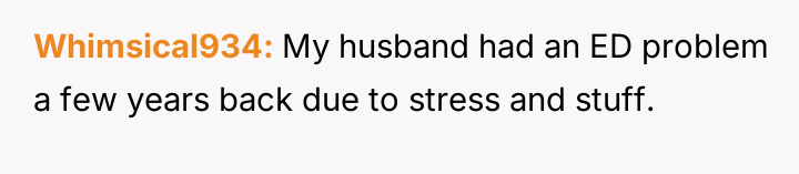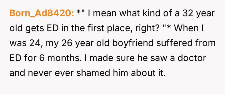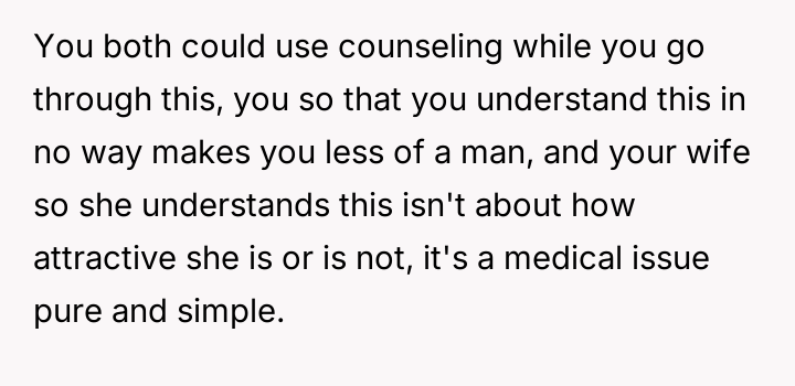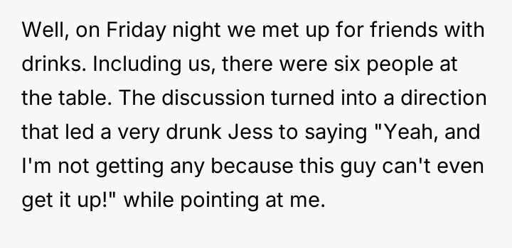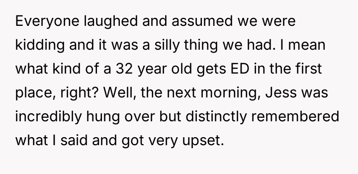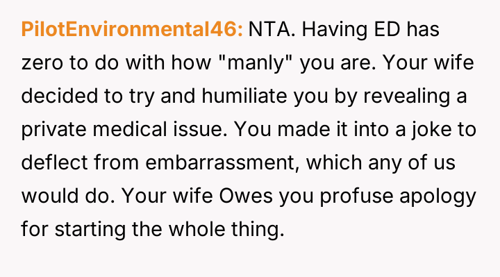 The original poster (OP) is dealing with the stress of new erectile dysfunction and feels deeply hurt and exposed after his wife publicly mocked his private medical issue in front of friends.