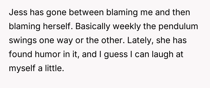 His wife Jess, caught in the turbulent crossfire of blame and vulnerability, oscillates between frustration and self-doubt, trying to navigate the storm that threatens to pull them apart.