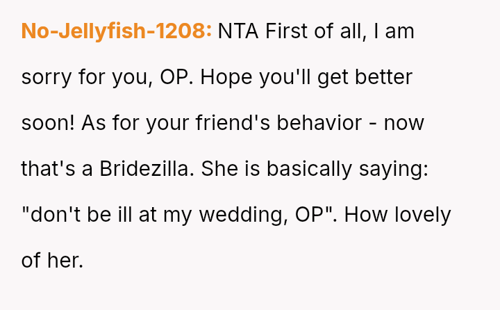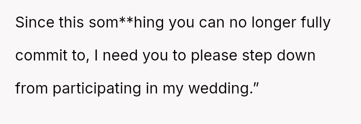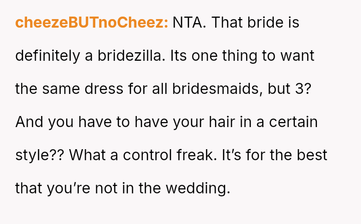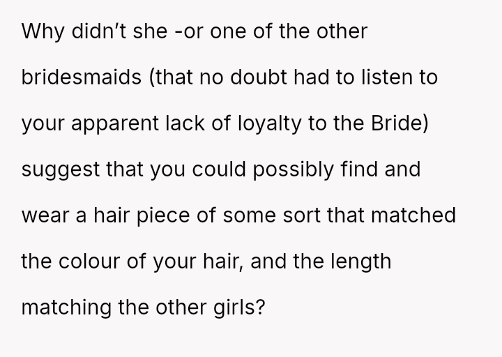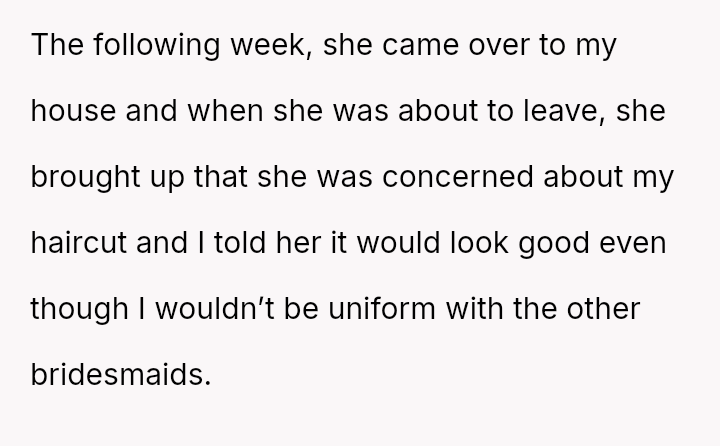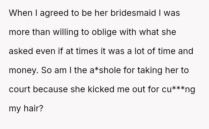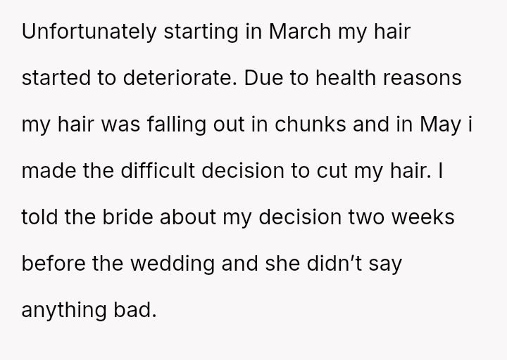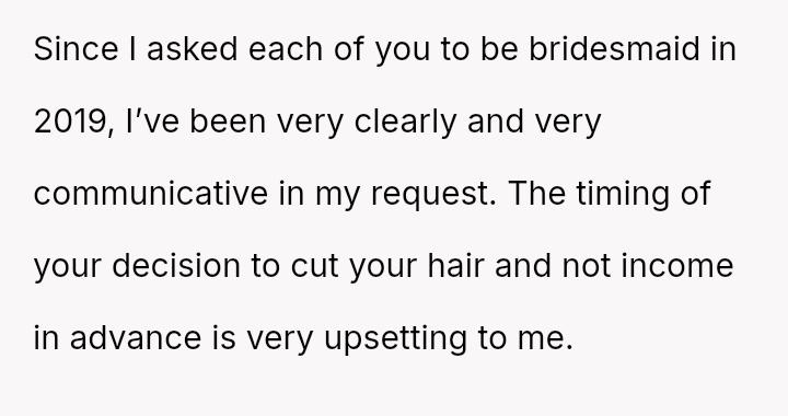 The original poster (OP) found herself in a distressing situation where her commitment to a demanding bridesmaid role, which involved significant financial and time investment, was abruptly terminated due to a personal health-related haircut.