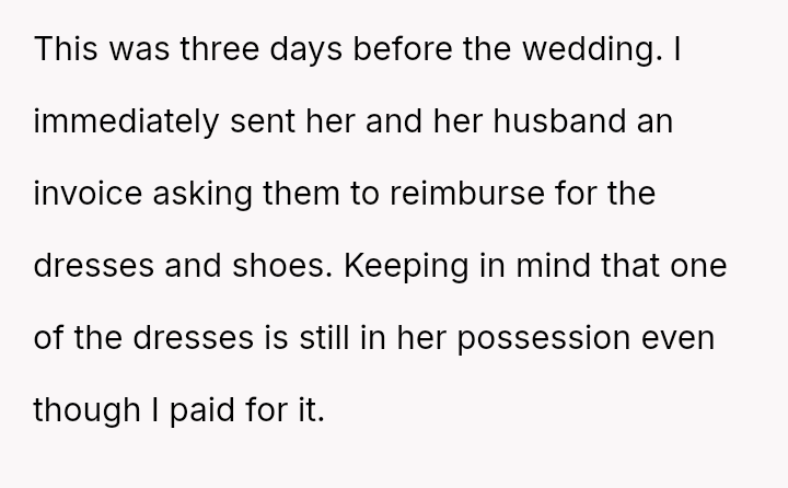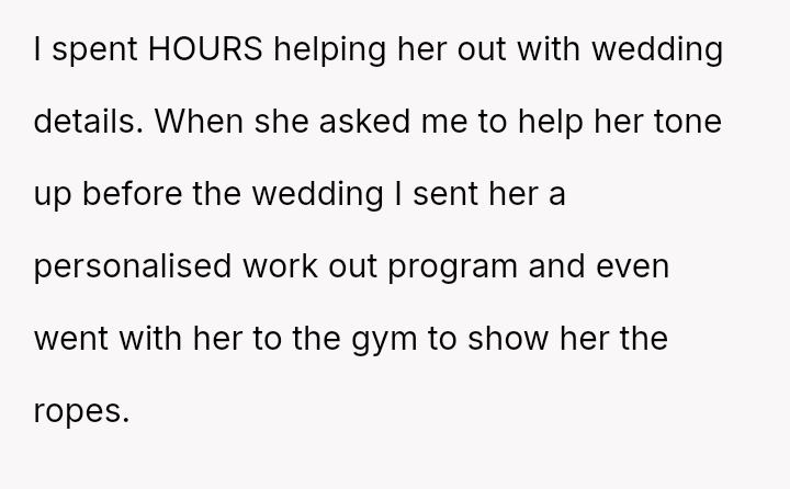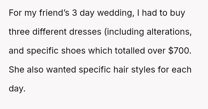 She had poured her heart and soul into preparing for her friend’s three-day wedding, spending over $700 on dresses, shoes, and styling to meet every expectation.