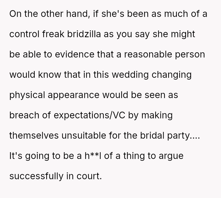 The central question for debate is whether the OP was justified in taking legal action to recover expenses after being removed from the bridal party for a health-related change, or if the bride's expectations regarding aesthetic uniformity and timely communication superseded the OP's unforeseen personal circumstances.
