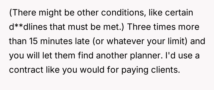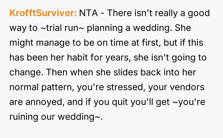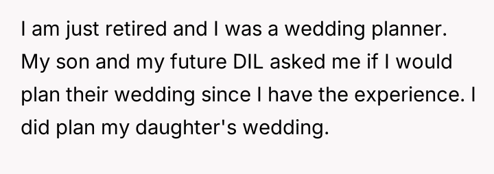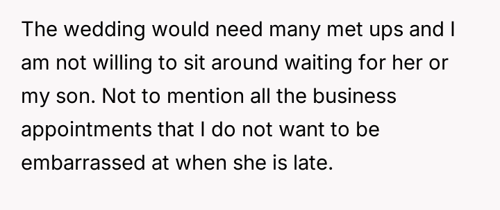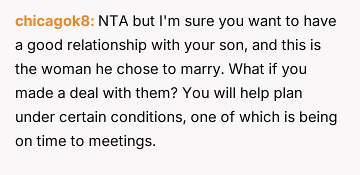 The original poster (OP) is refusing to use their professional sk**ls to plan their son's wedding, citing a deep-seated frustration with the future daughter-in-law's consistent tardiness.
