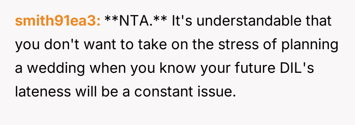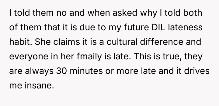 AITA for refusing to plan my son/DIL wedding because my future DIL is always late