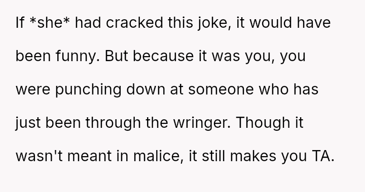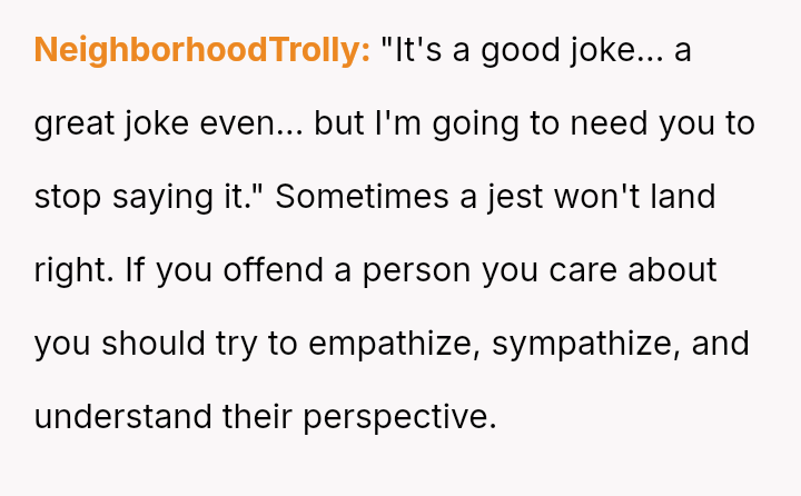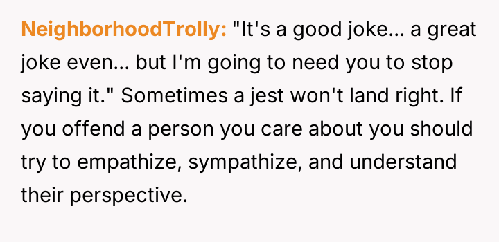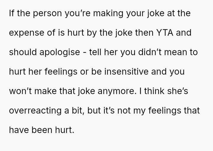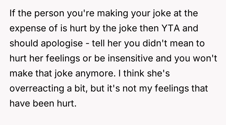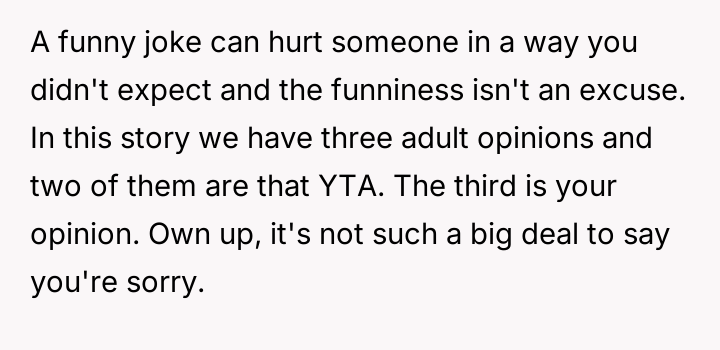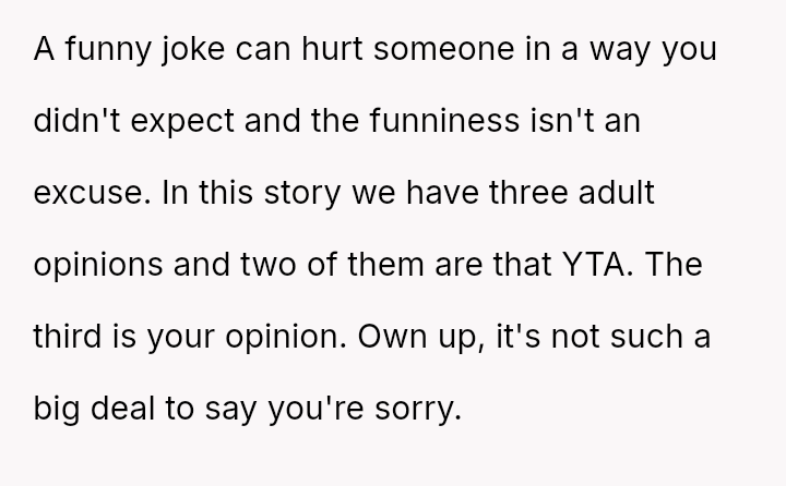 The core question remains whether the intent (humor) overrides the impact (hurt feelings) in this close familial relationship.