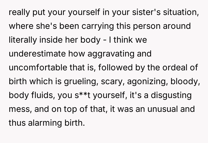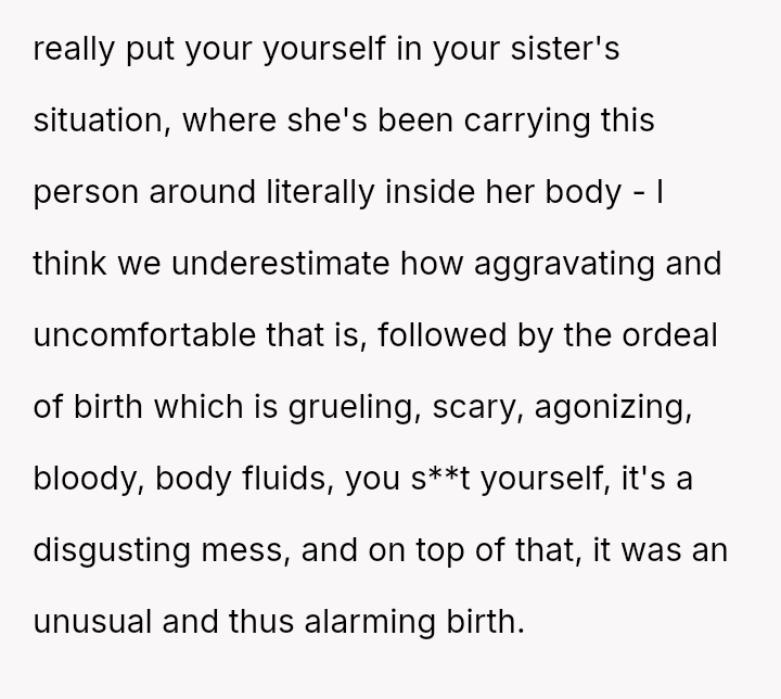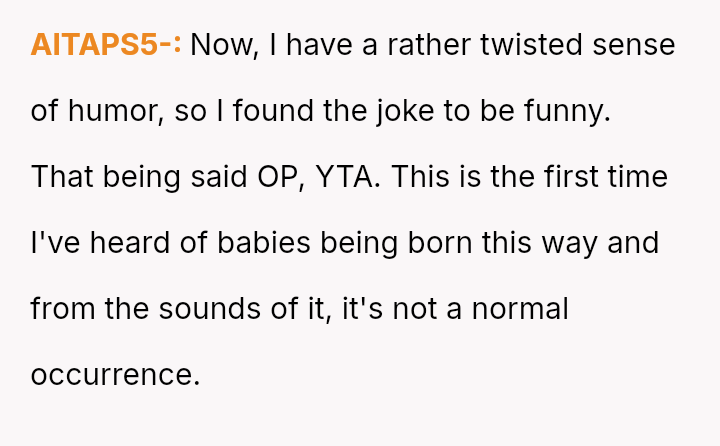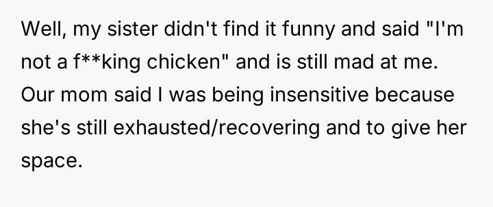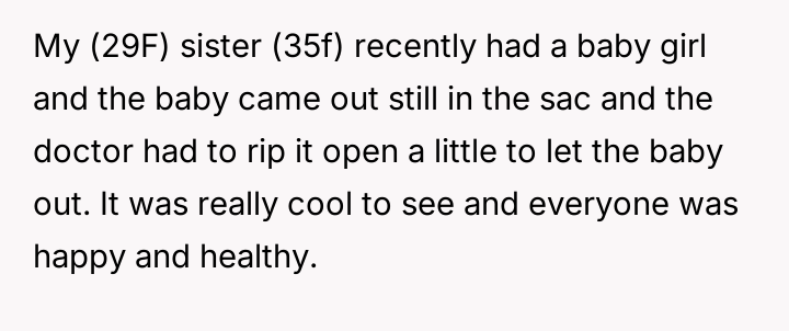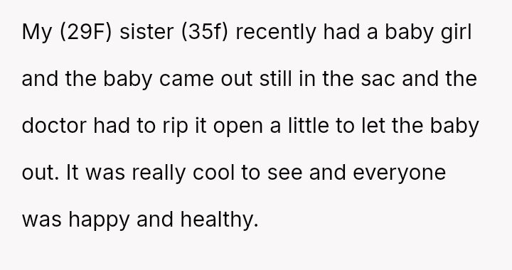 The original poster (OP) finds themselves in conflict with their sister because a joke about the birthing experience was poorly received.