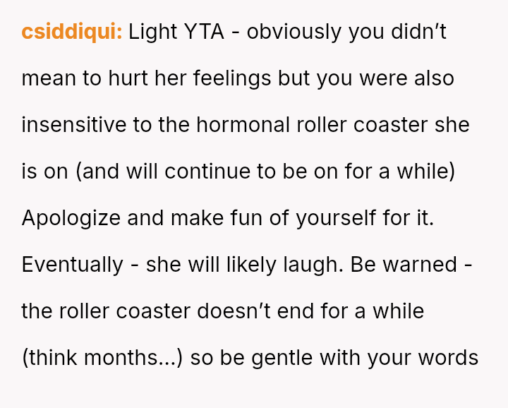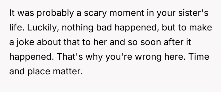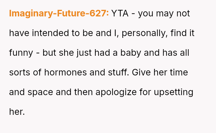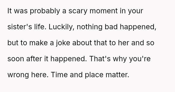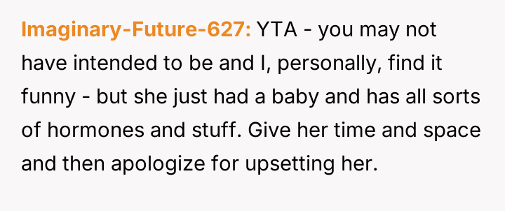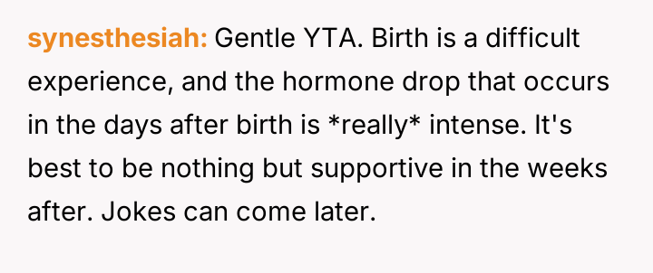 Given the sister's heightened emotional state post-delivery, was the OP's joke an understandable lapse in judgment regarding timing and context, or was it a clear failure to respect the sister's boundaries during a vulnerable time?