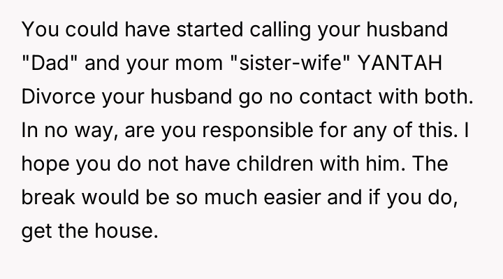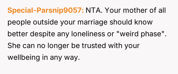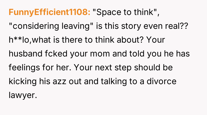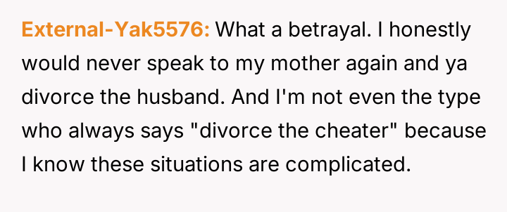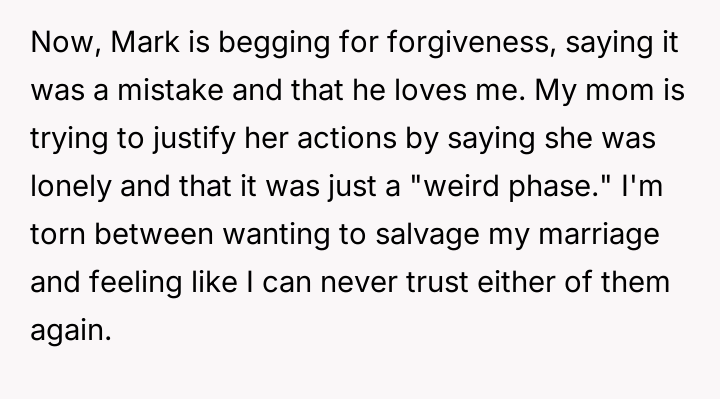 Given the depth of the v***ation by both parties, is the OP justified in considering the end of her marriage and the complete severance of the relationship with her mother, or would attempting reconciliation, given the severity of the betrayal, represent an unsustainable emotional risk?