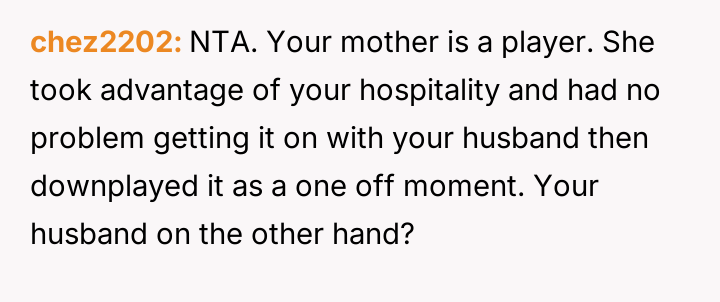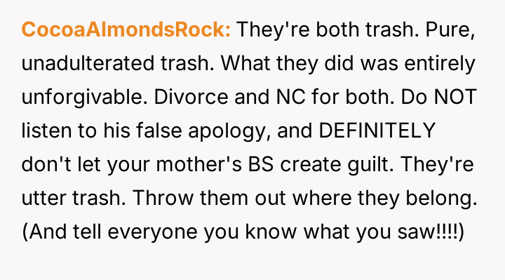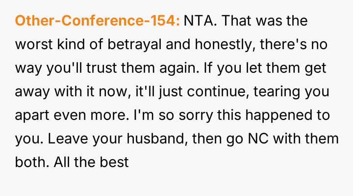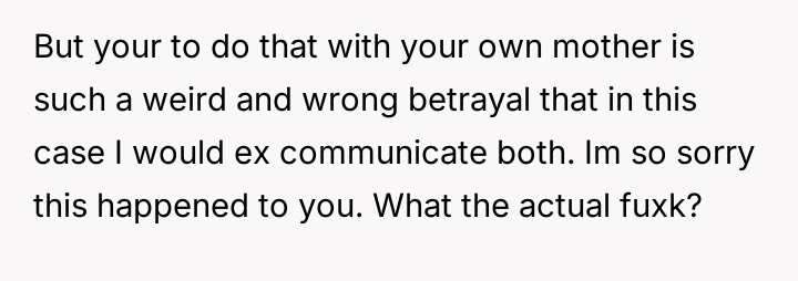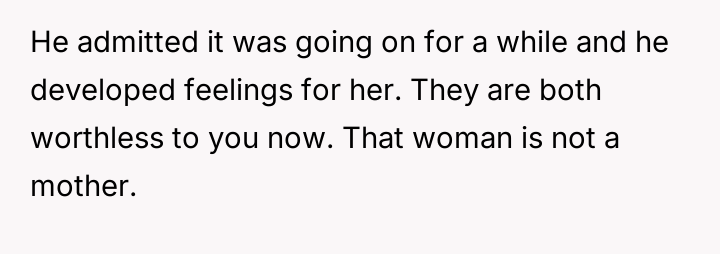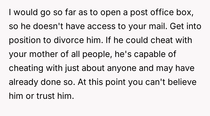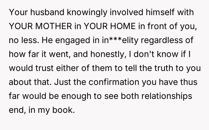 The original poster (OP) is facing a severe emotional crisis, dealing with the discovery of in***elity involving both her husband and her mother.
