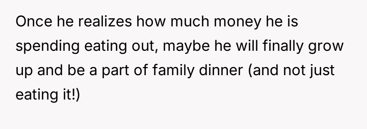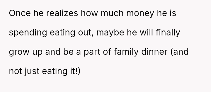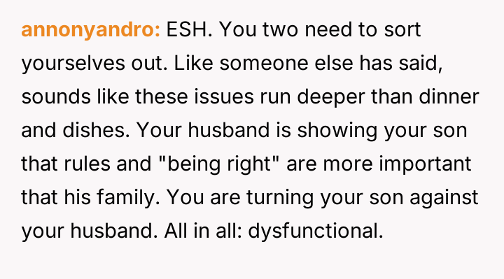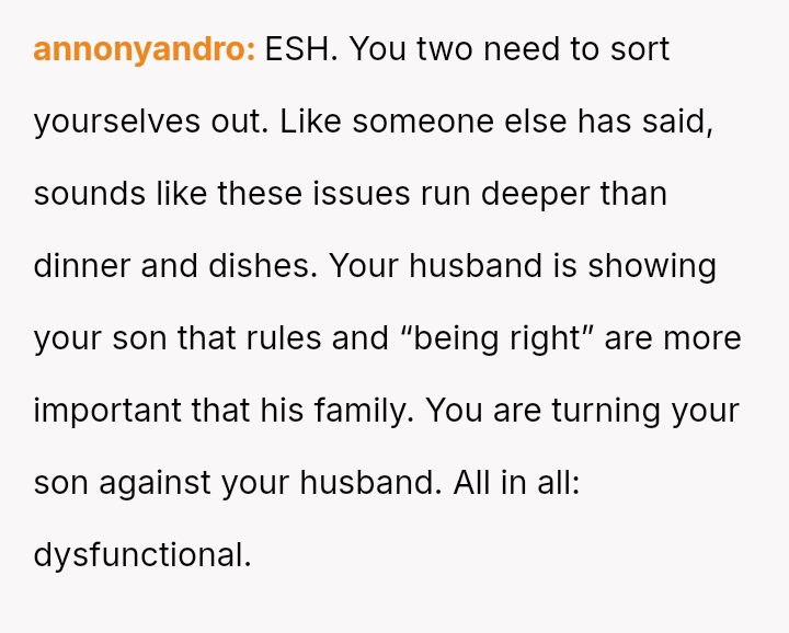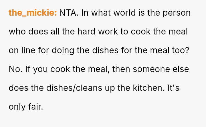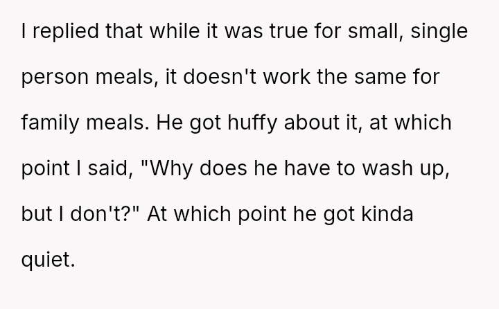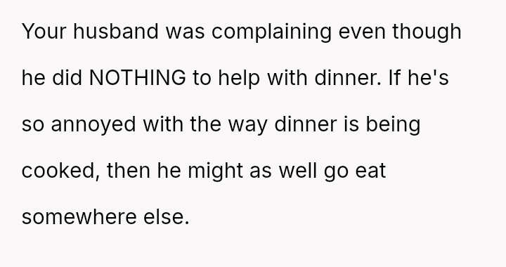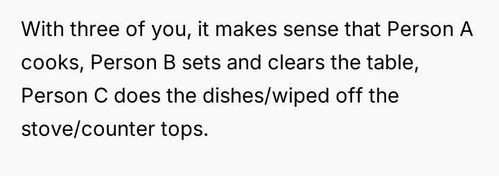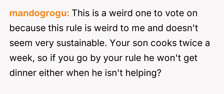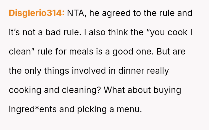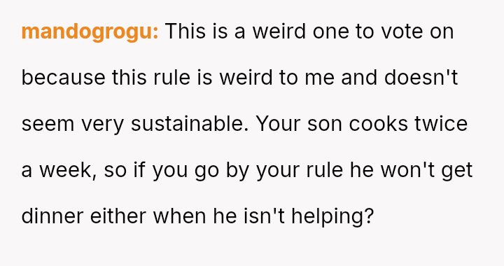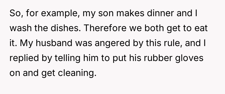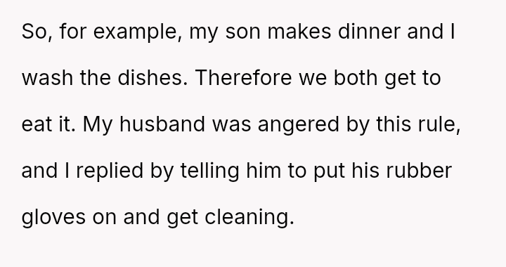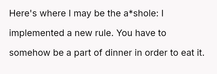 Is the OP justified in linking the right to eat the family meal to contributing to its preparation or clean-up, effectively enforcing the husband's desired ch**e standard by proxy, or has she created an overly rigid and punitive structure within the family dynamic?