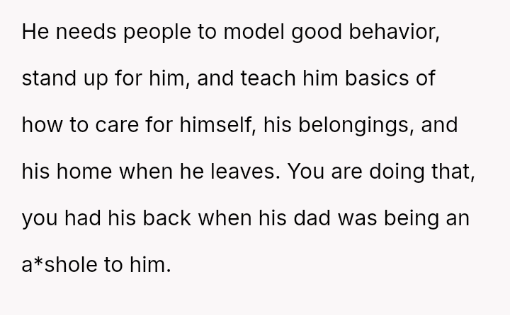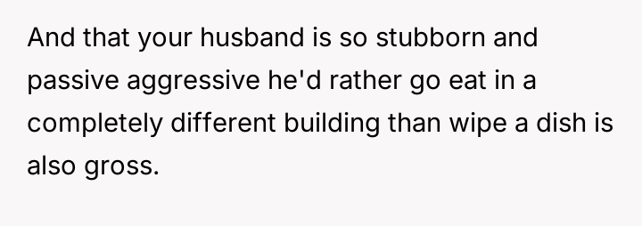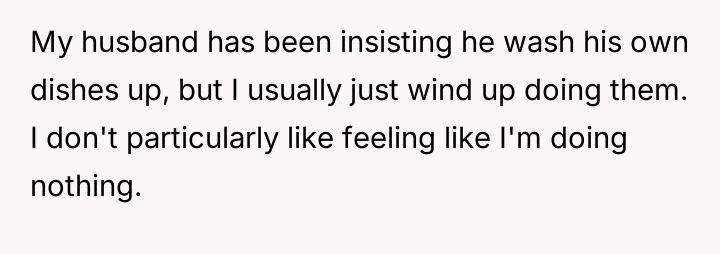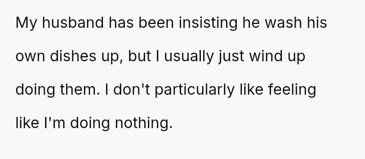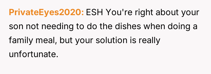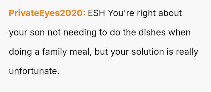 The OP initially enabled the son by doing the dishes after his family meals, but her husband insisted the son must clean up his own mess, leading to a stalemate.