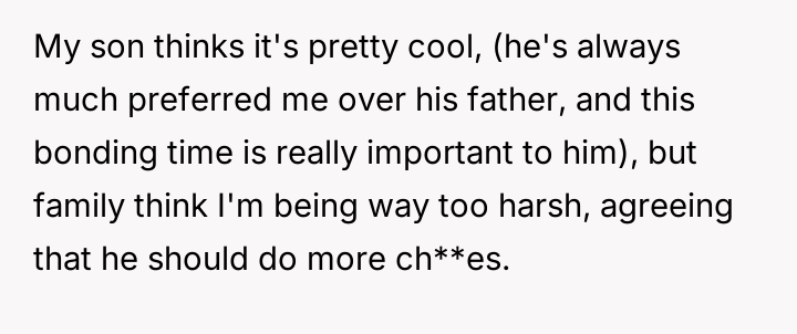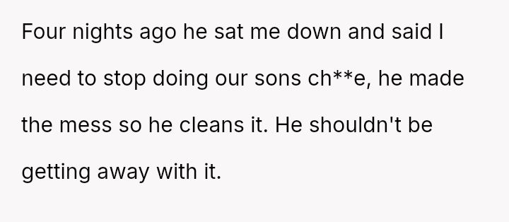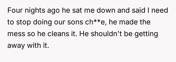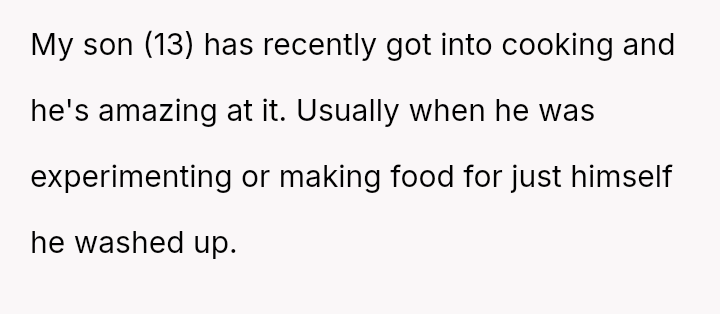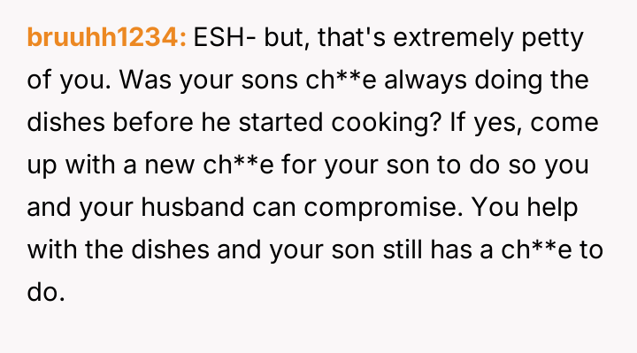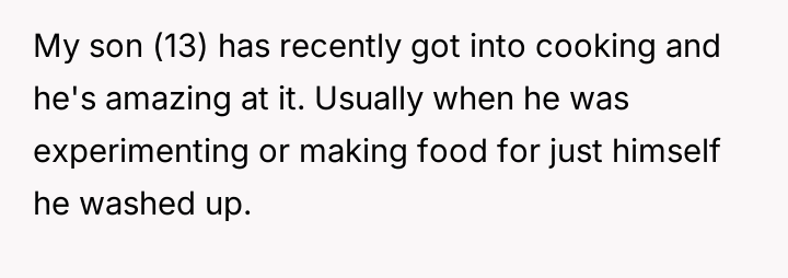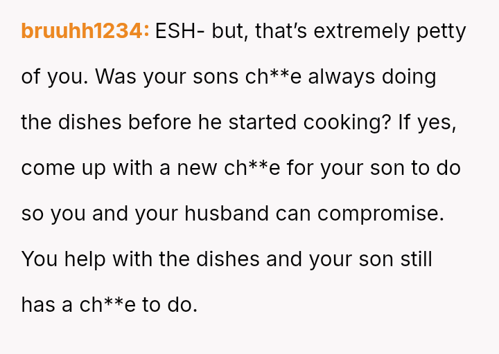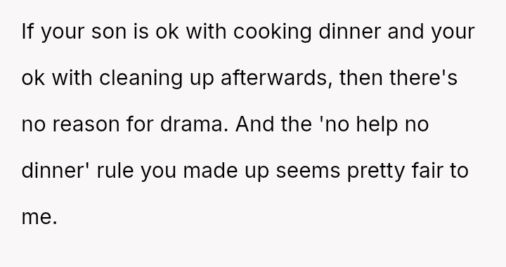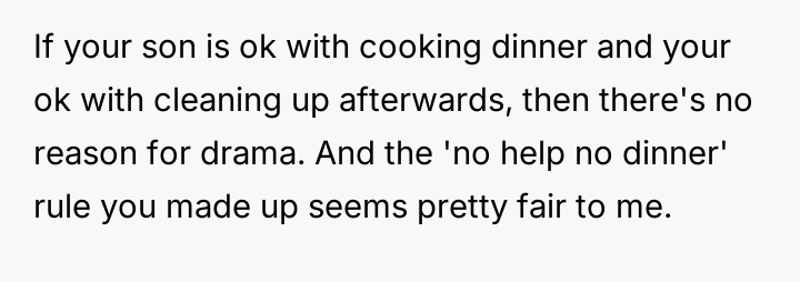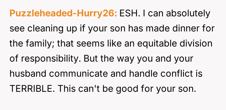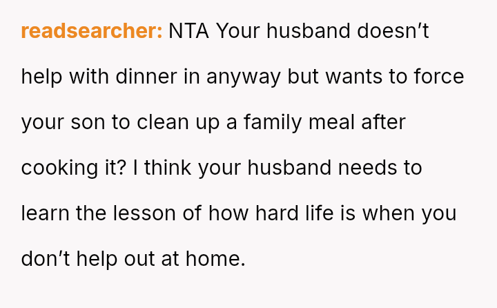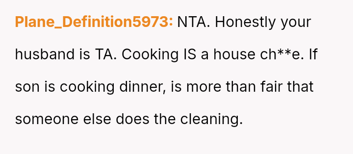 The original poster (OP) is facing conflict with her husband over household ch**e distribution, specifically regarding their 13-year-old son's cooking clean-up.