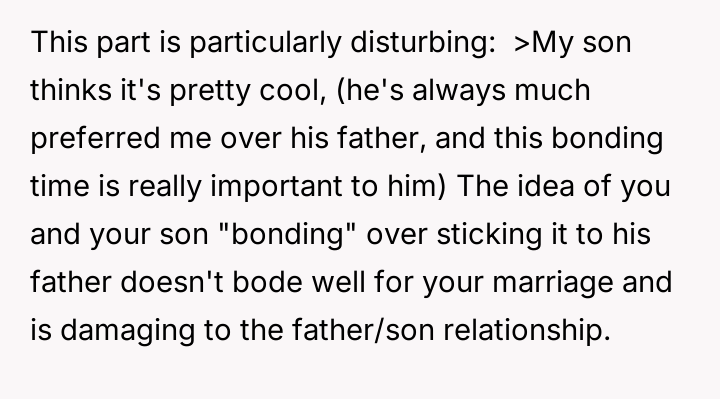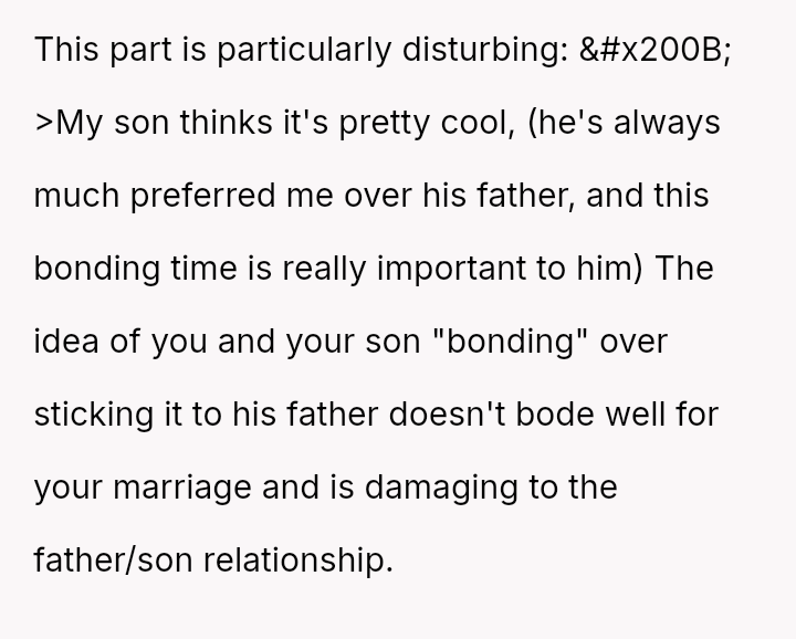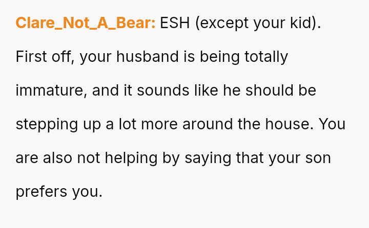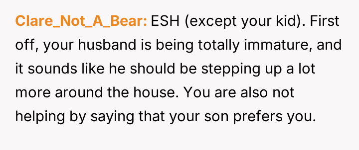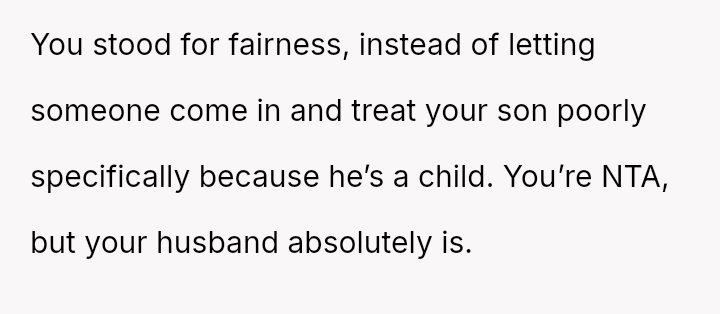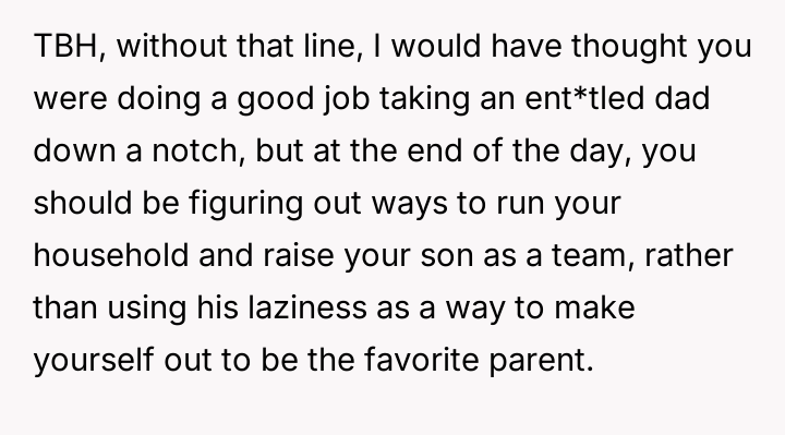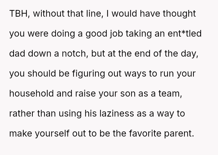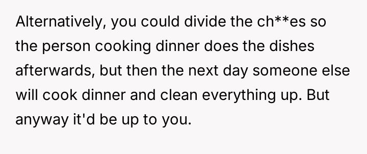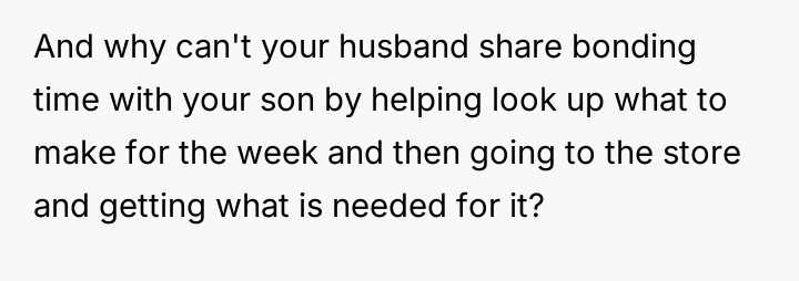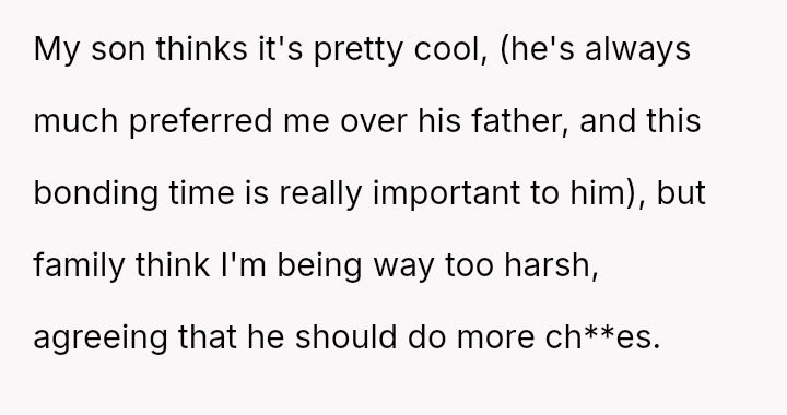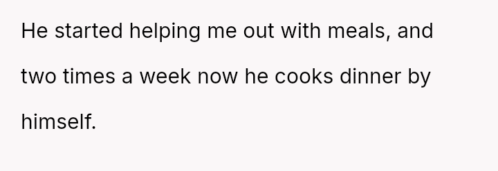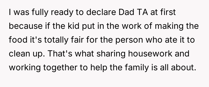 The original poster (OP) is facing conflict with her husband over household ch**e distribution, specifically regarding their 13-year-old son's cooking clean-up.